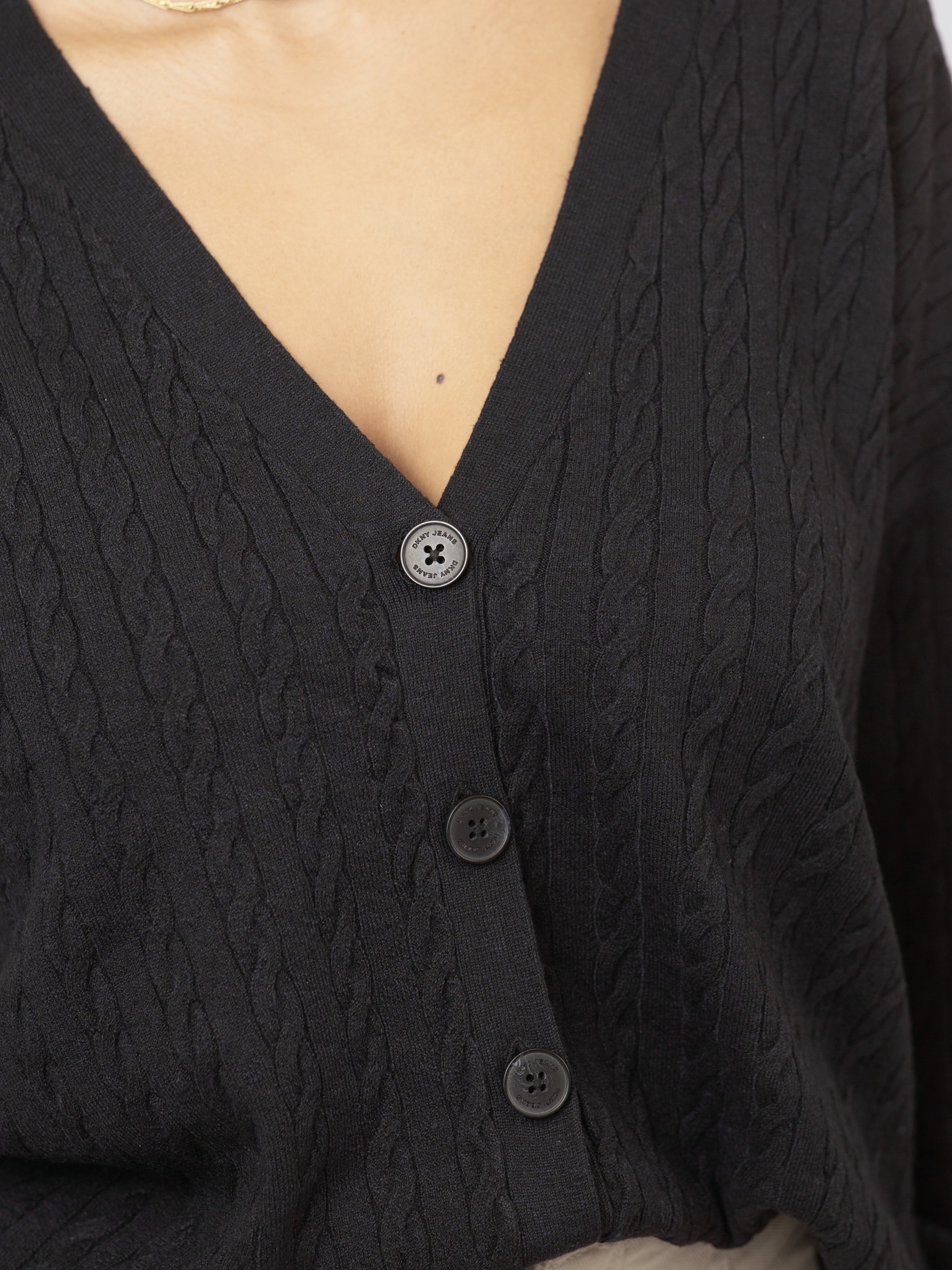 Женский вязаный кардиган оверсайз DKNY чёрного цвета — актуальная модель с V-образным вырезом и застёжкой на пуговицы. Спущенная линия плеч создаёт расслабленный силуэт, а фактурная вязка добавляет выразительности образу.
