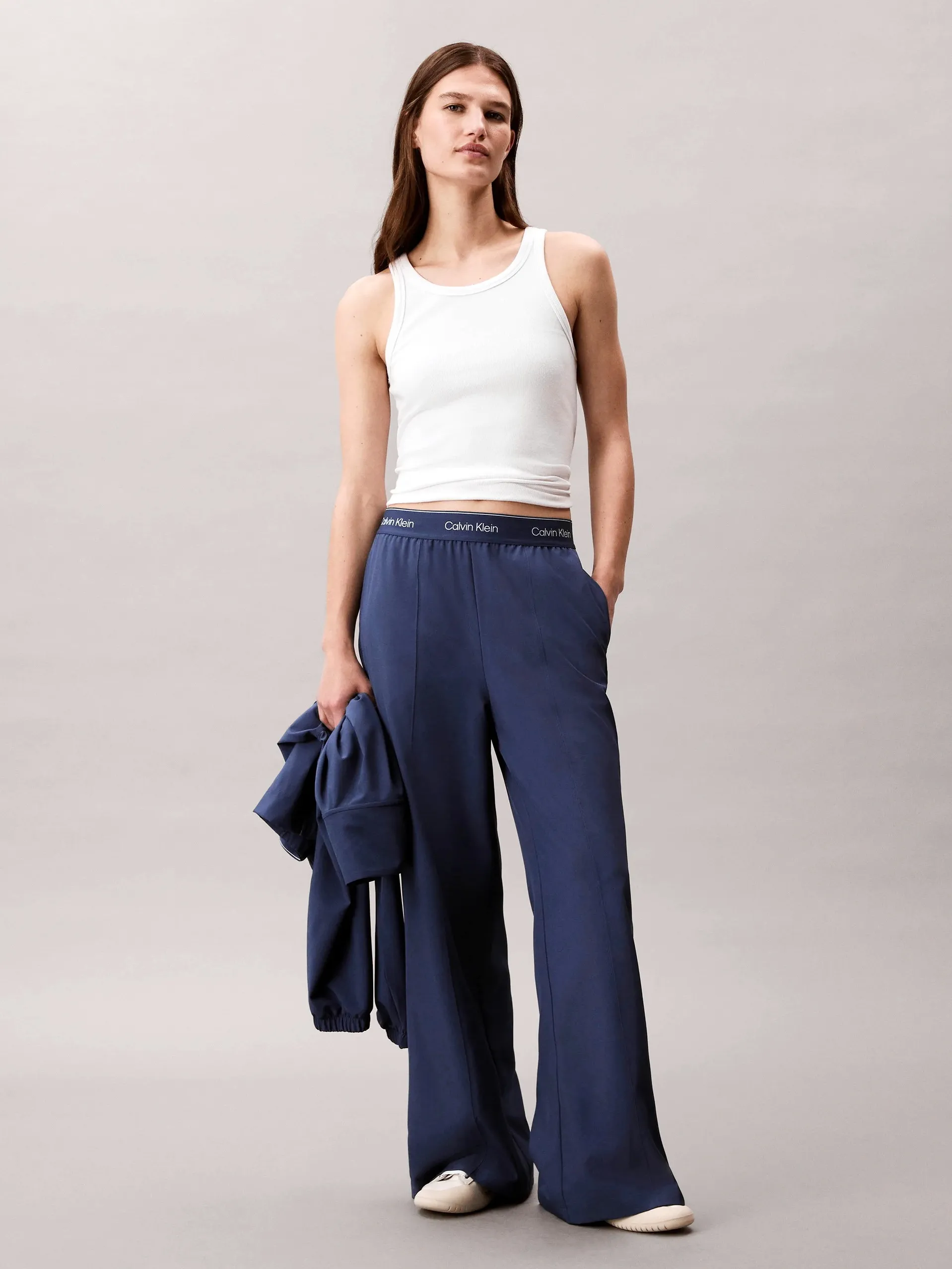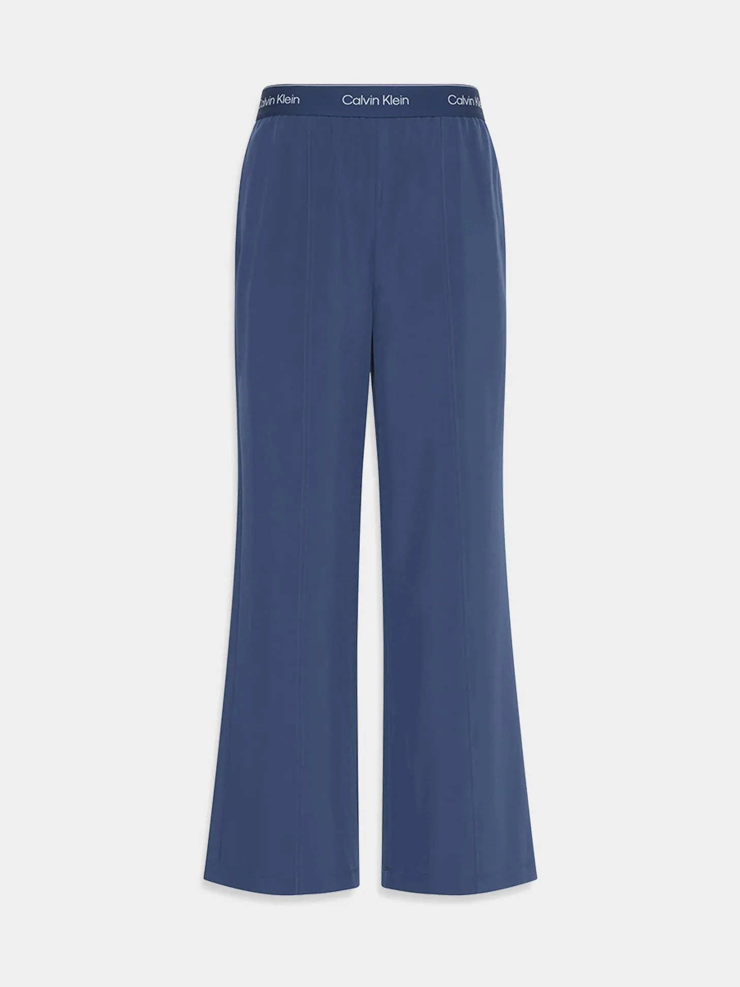 Женские лёгкие спортивные брюки из эластичного полиэстера. Модель прямого расклешённого кроя со средней посадкой на талии и эластичным поясом с фирменным логотипом бренда. Изделие дополнено боковыми карманами.