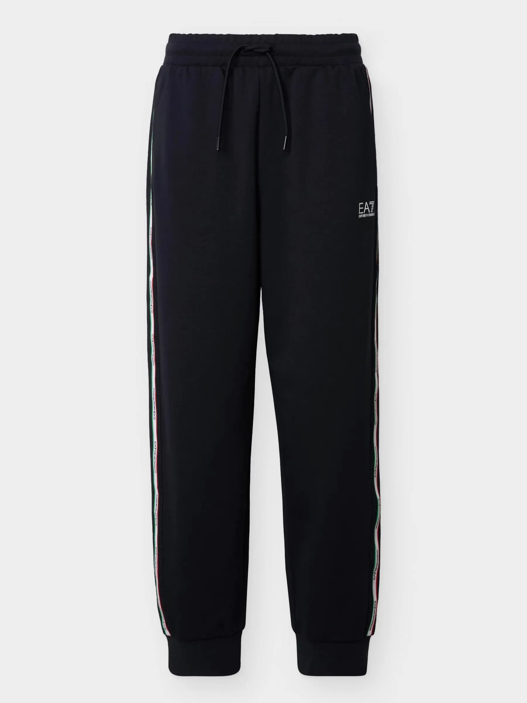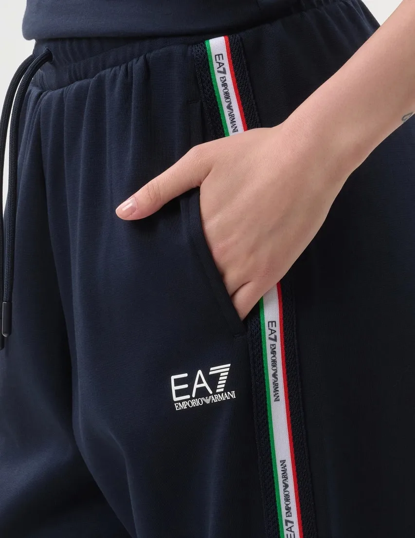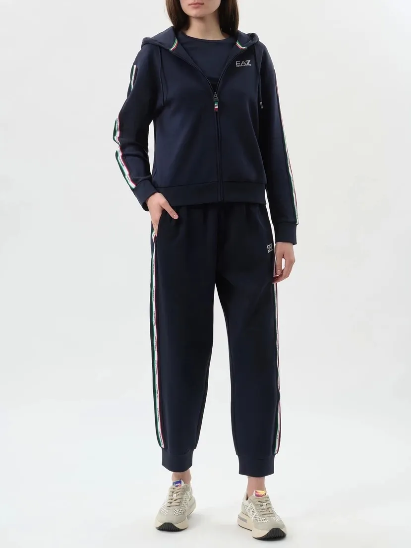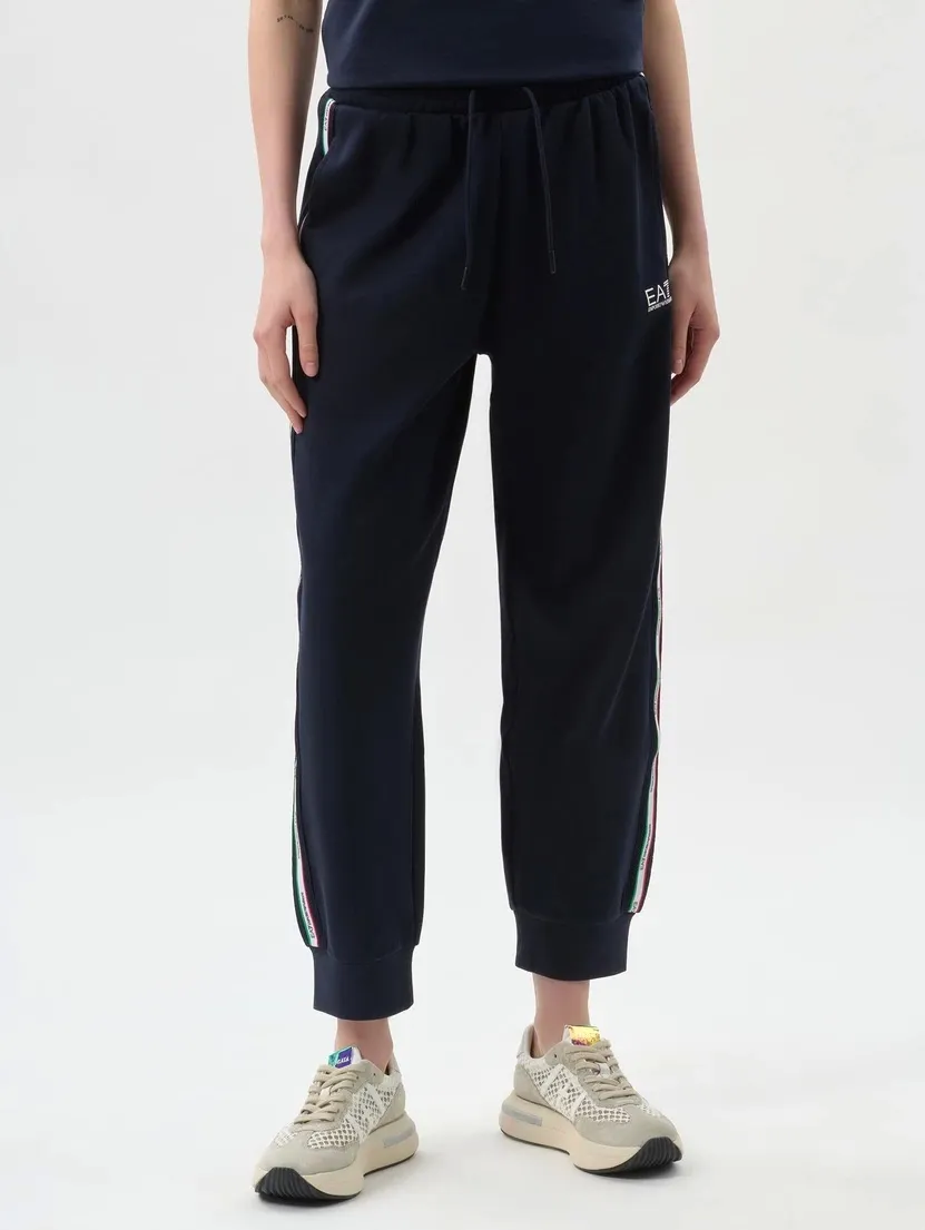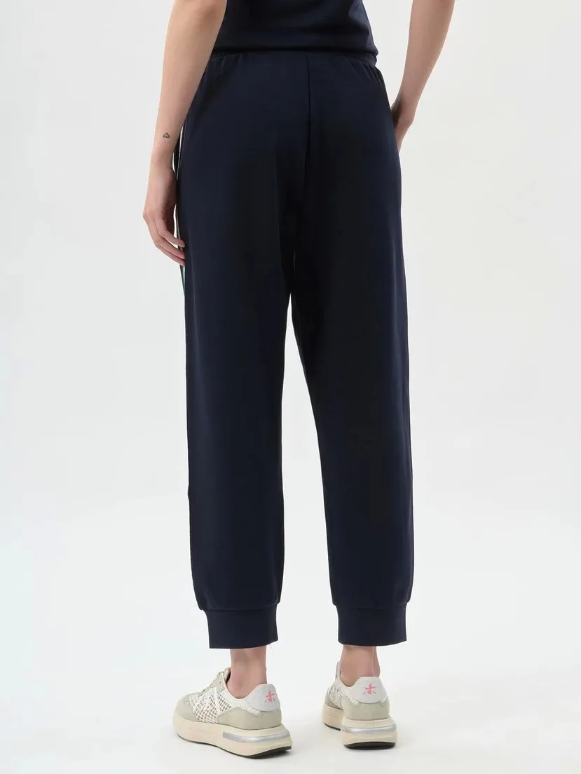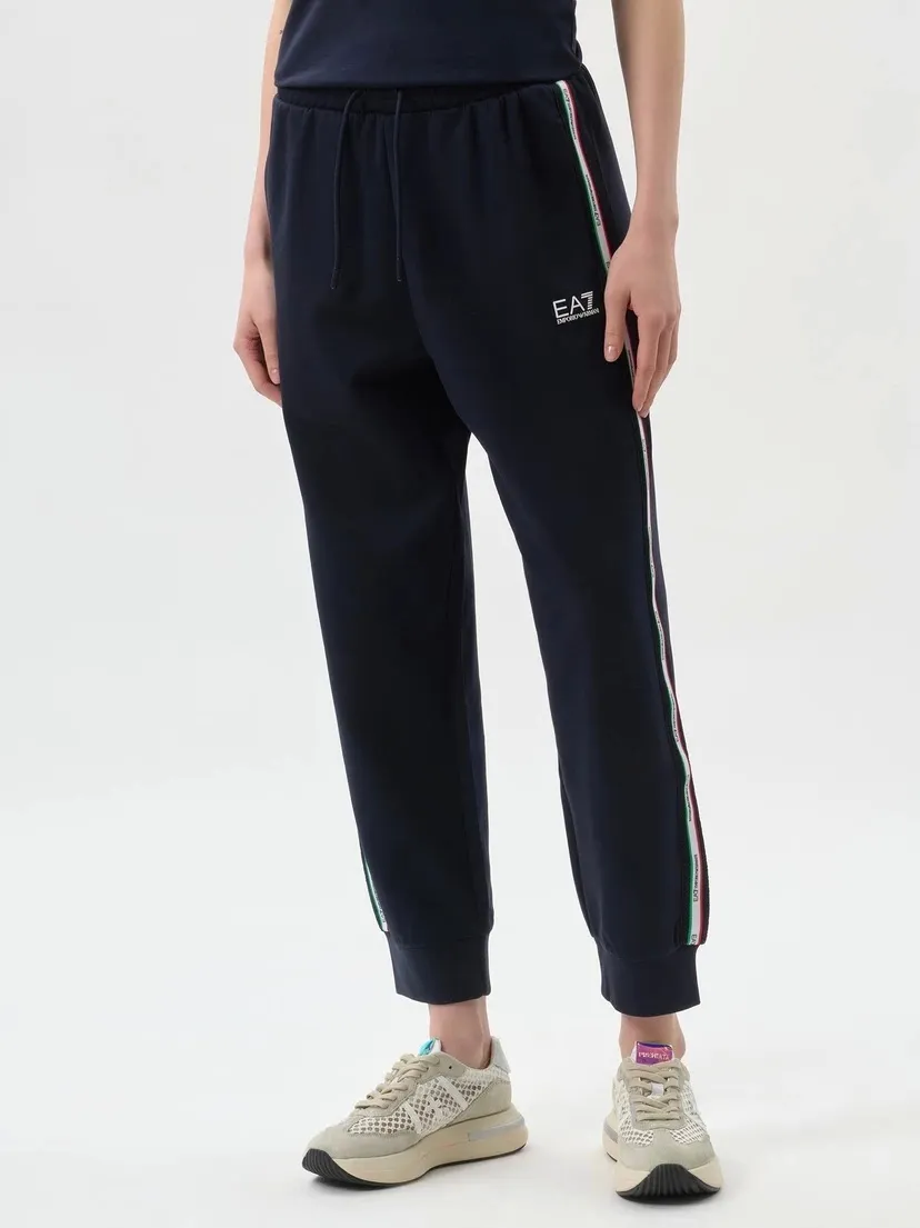 Женские спортивные брюки прямого кроя с манжетами — удобная и стильная модель для активного образа жизни. Мягкий материал из хлопка и полиэстера обеспечивает комфорт и свободу движений. Эластичный пояс со шнурком гарантирует удобную посадку. Брюки дополнены боковыми карманами и фирменными лампасами с логотипом бренда. Отлично подходят для спорта и прогулок. Дополните образ спортивной толстовкой из коллекции бренда для создания спортивного комплекта.