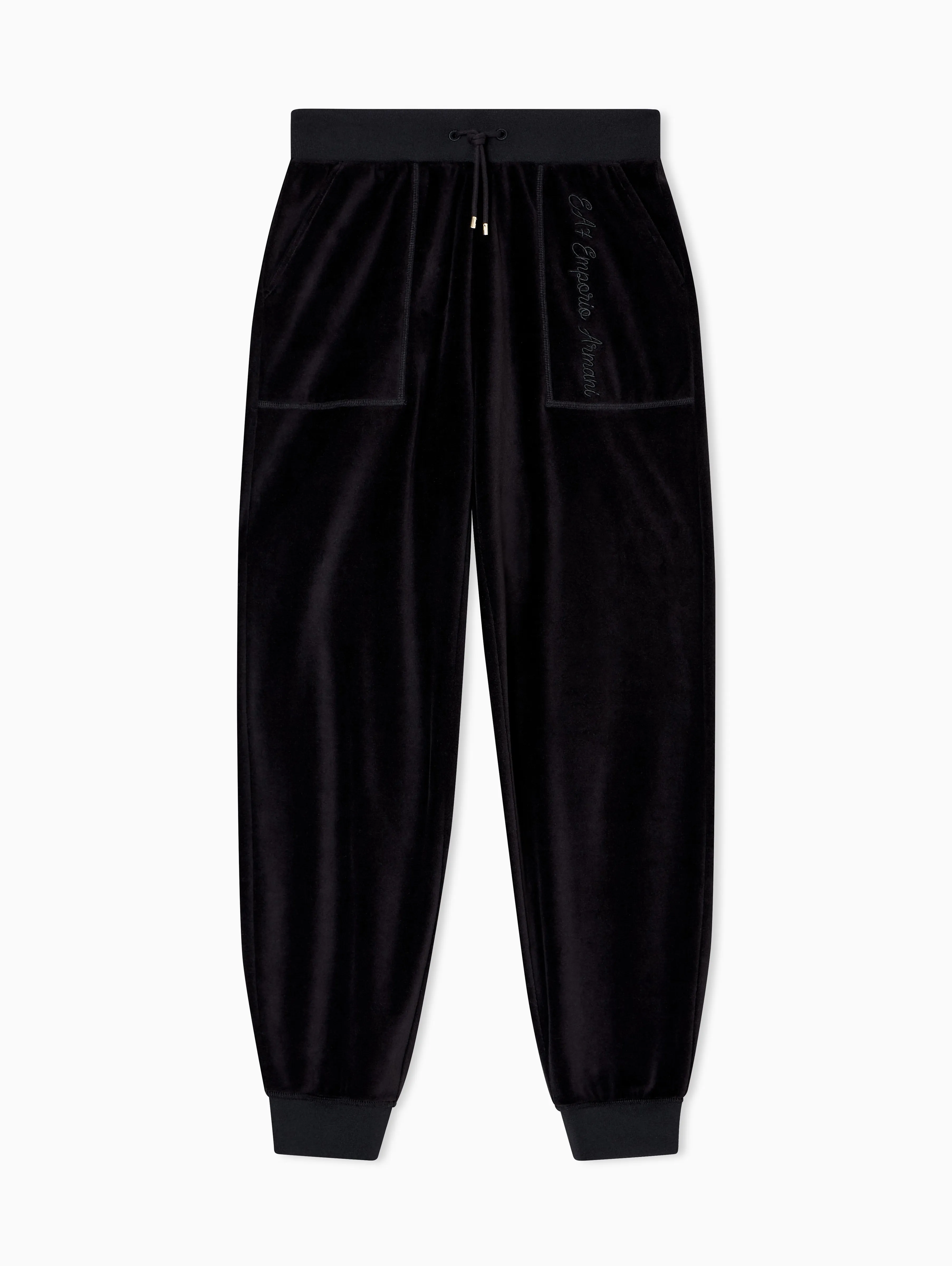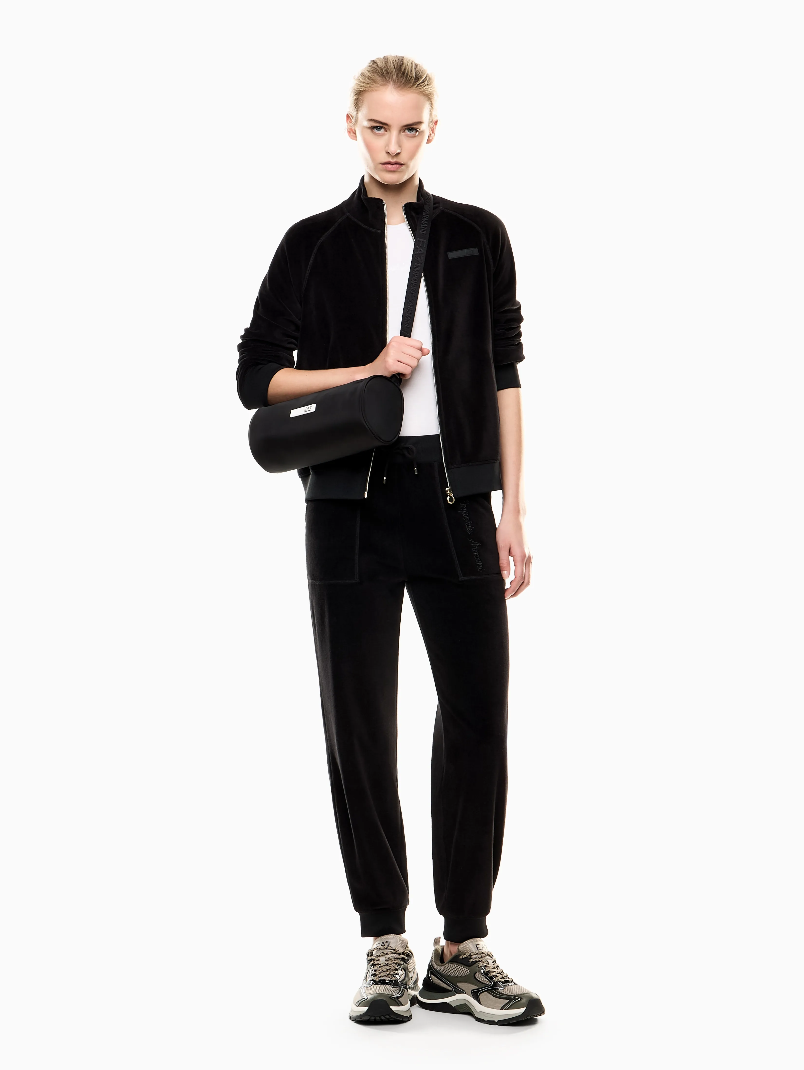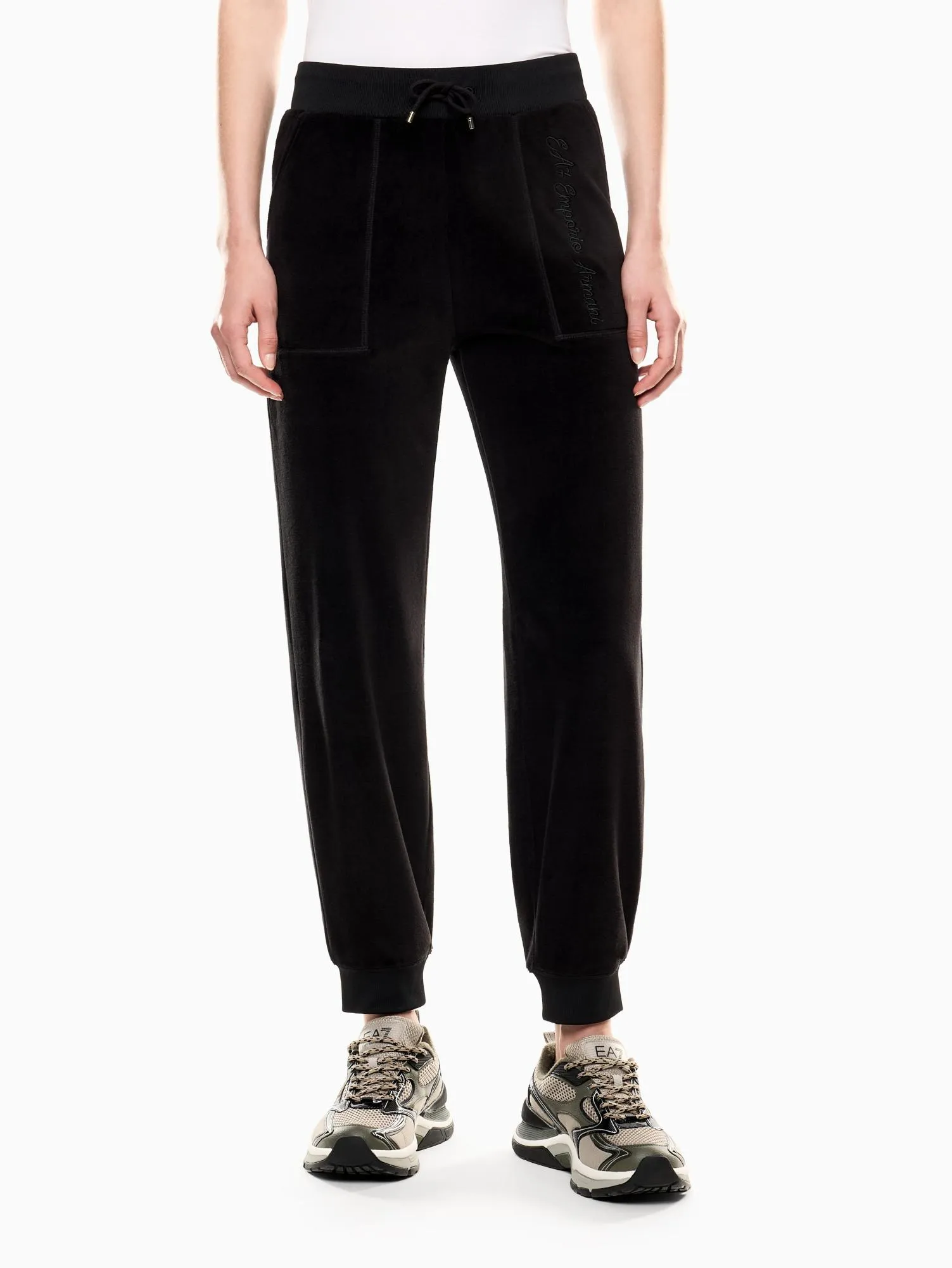 Женские спортивные брюки EA7 из мягкого велюра черного цвета — сочетание комфорта и фирменного стиля Emporio Armani. Джоггеры свободного кроя с манжетами, боковыми карманами и поясом на кулиске, украшены вышитым логотипом EA7. Дополните образ толстовкой из коллекции.