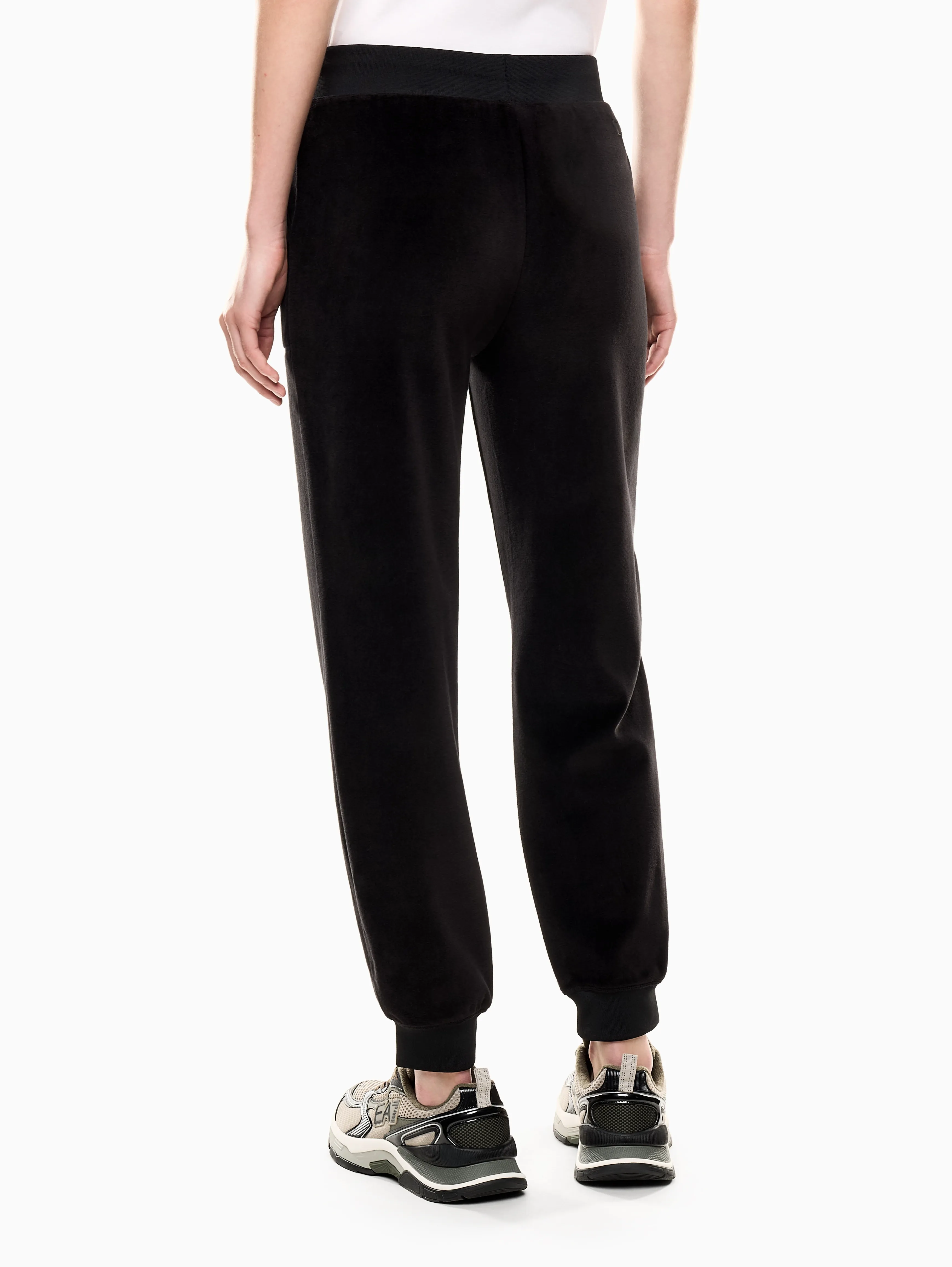 Женские спортивные брюки EA7 из мягкого велюра черного цвета — сочетание комфорта и фирменного стиля Emporio Armani. Джоггеры свободного кроя с манжетами, боковыми карманами и поясом на кулиске, украшены вышитым логотипом EA7. Дополните образ толстовкой из коллекции.