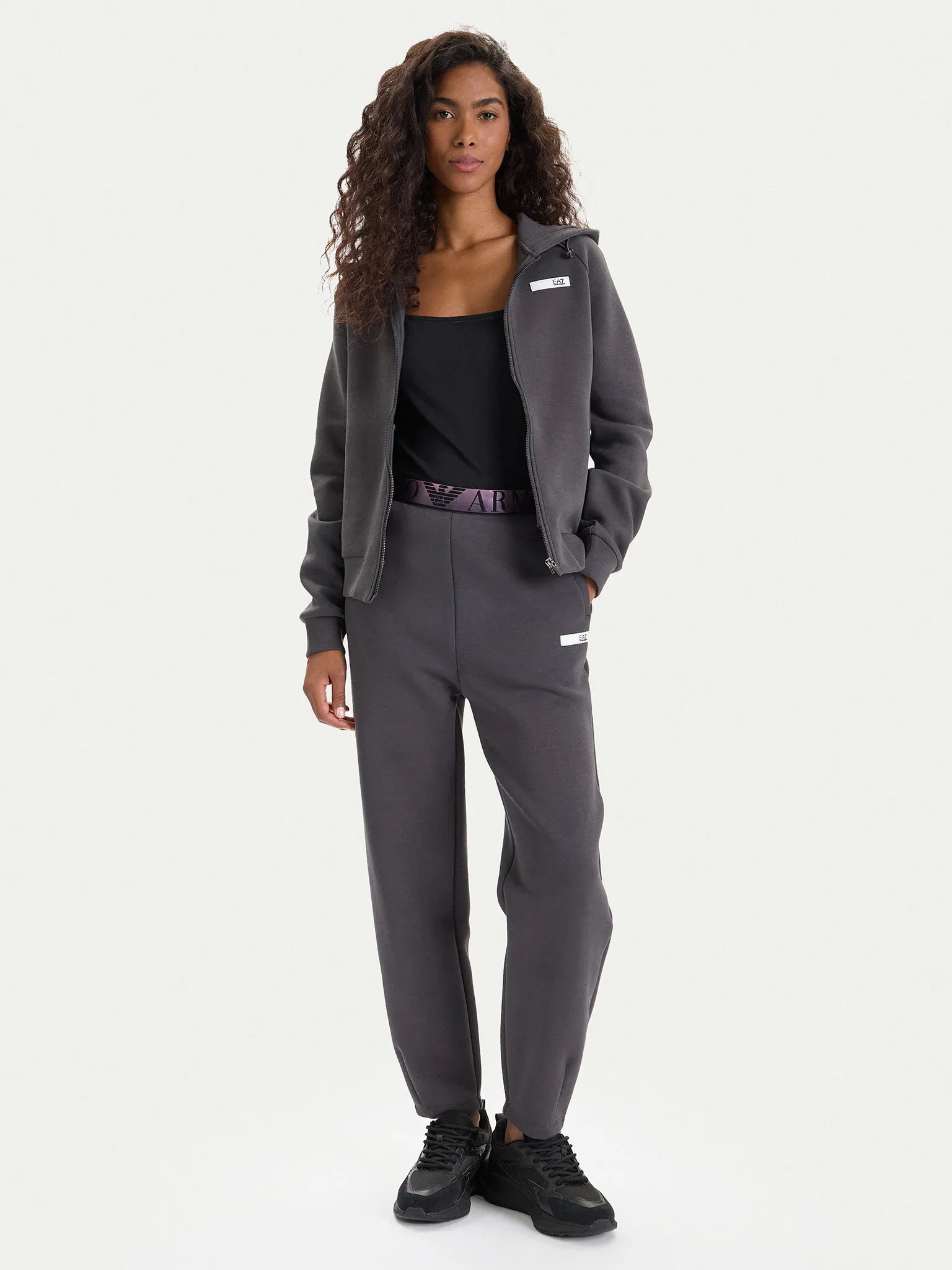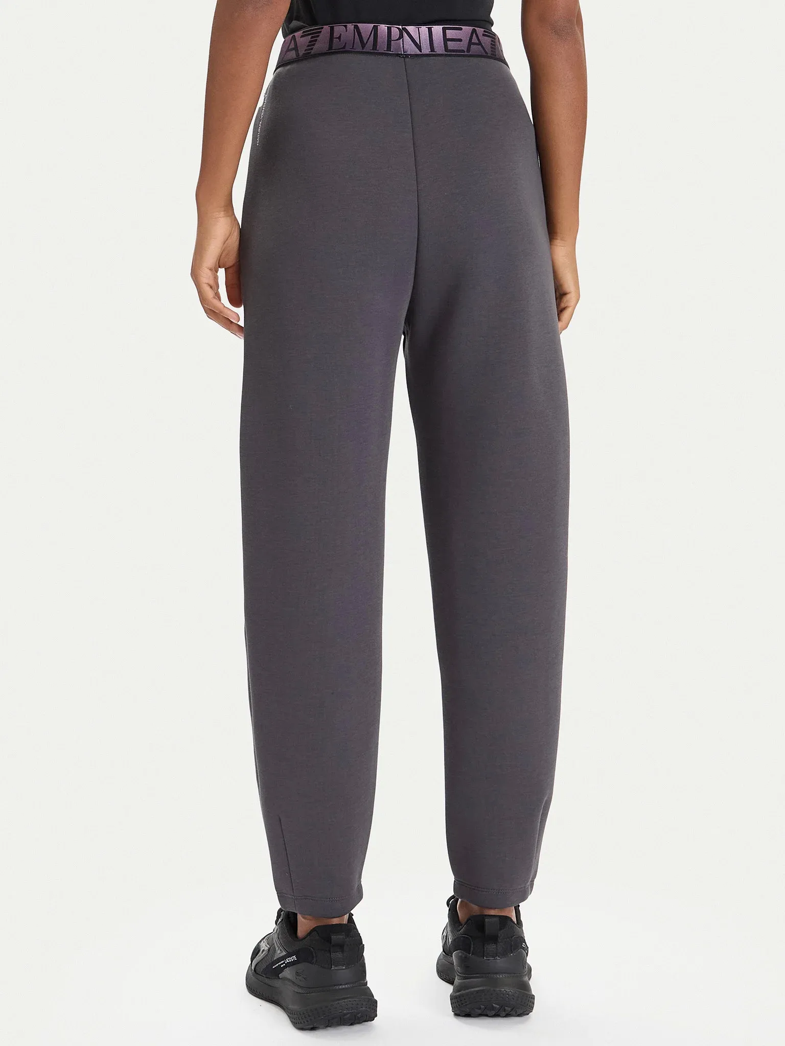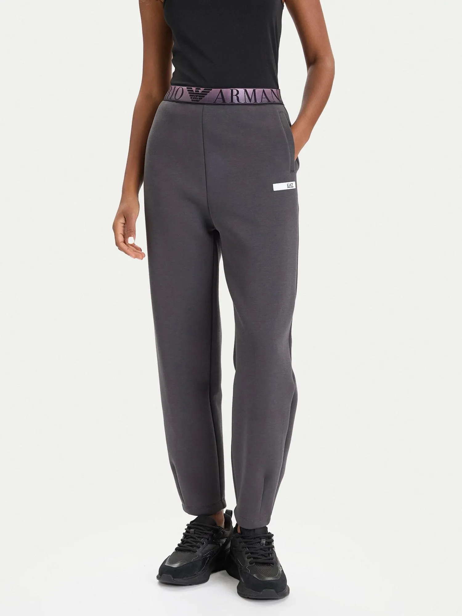 Женские спортивные брюки EA7 серого цвета свободного кроя с манжетами на резинке сочетают динамику стиля и комфорт. Выполнены из инновационного материала Natural VENTUS7 — сочетания натуральных и синтетических волокон, регулирующих температуру тела и отводящих влагу. Модель с боковыми карманами и фирменным эластичным поясом.