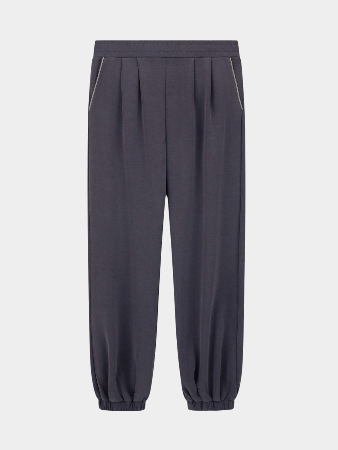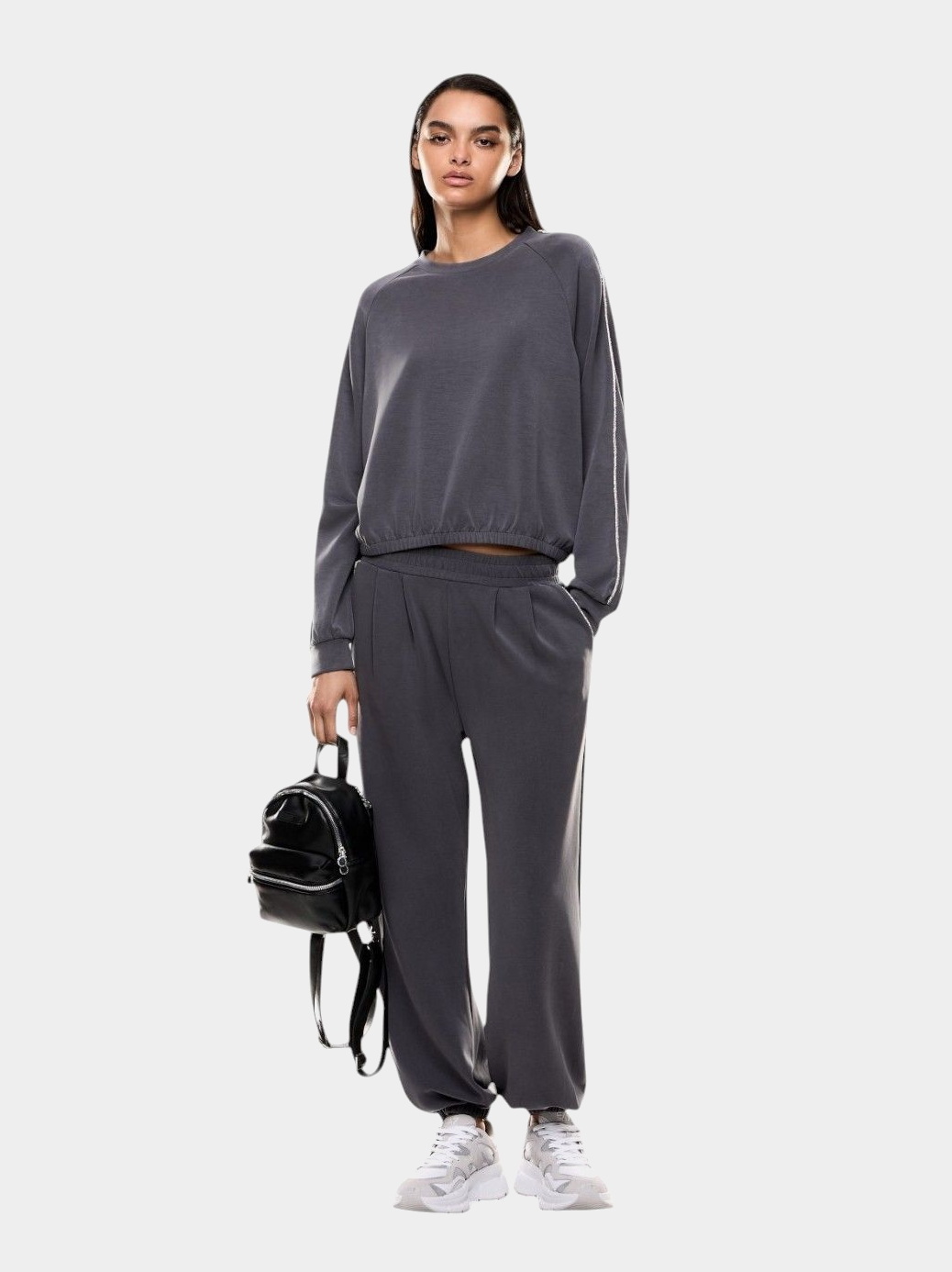 Женские джоггеры с лаконичным силуэтом украшены стразами по линии боковых карманов, добавляющими лёгкий блеск. Оверсайз-крой с манжетами, средняя посадка и эластичный пояс обеспечивают комфорт. Модель выполнена из эластичного модального интерлока, подходящего как для тренировок, так и для отдыха.