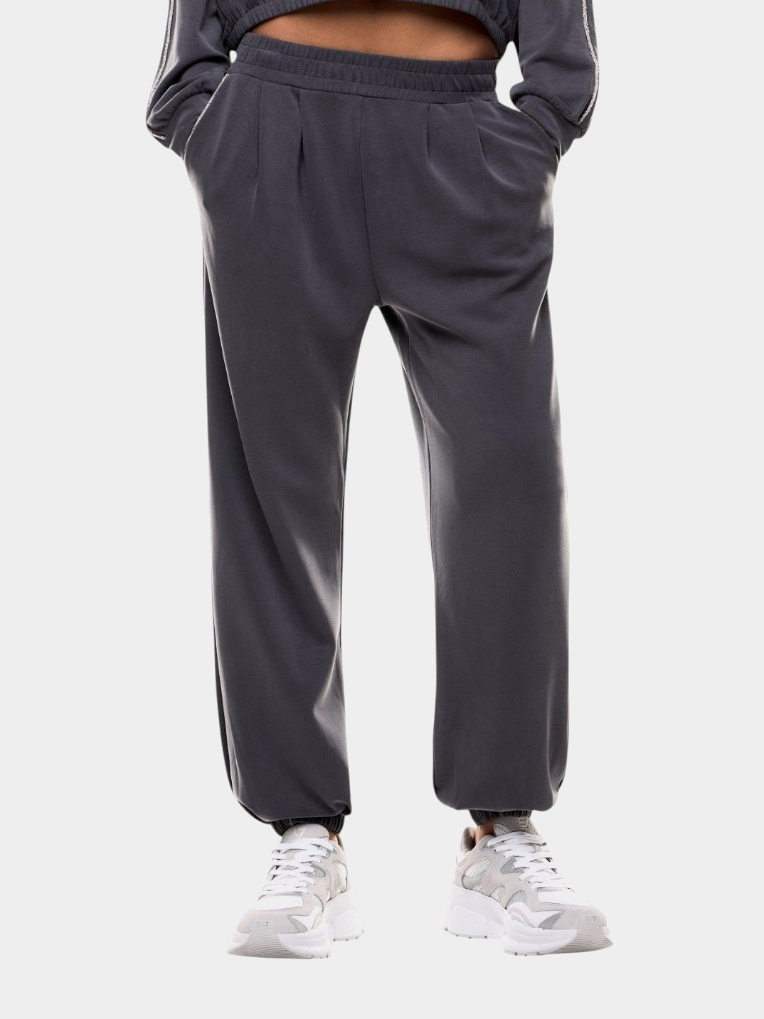 Женские джоггеры с лаконичным силуэтом украшены стразами по линии боковых карманов, добавляющими лёгкий блеск. Оверсайз-крой с манжетами, средняя посадка и эластичный пояс обеспечивают комфорт. Модель выполнена из эластичного модального интерлока, подходящего как для тренировок, так и для отдыха.