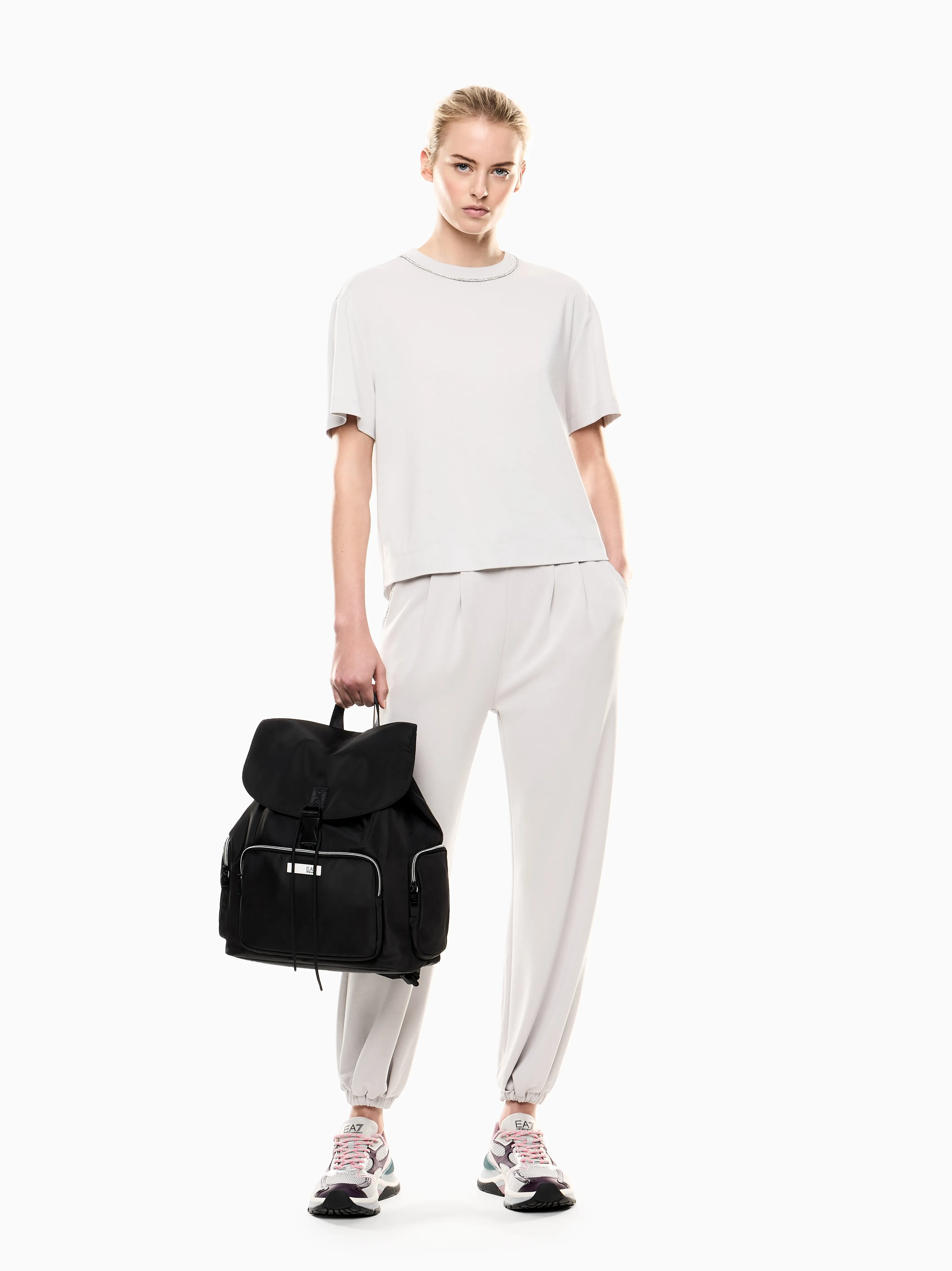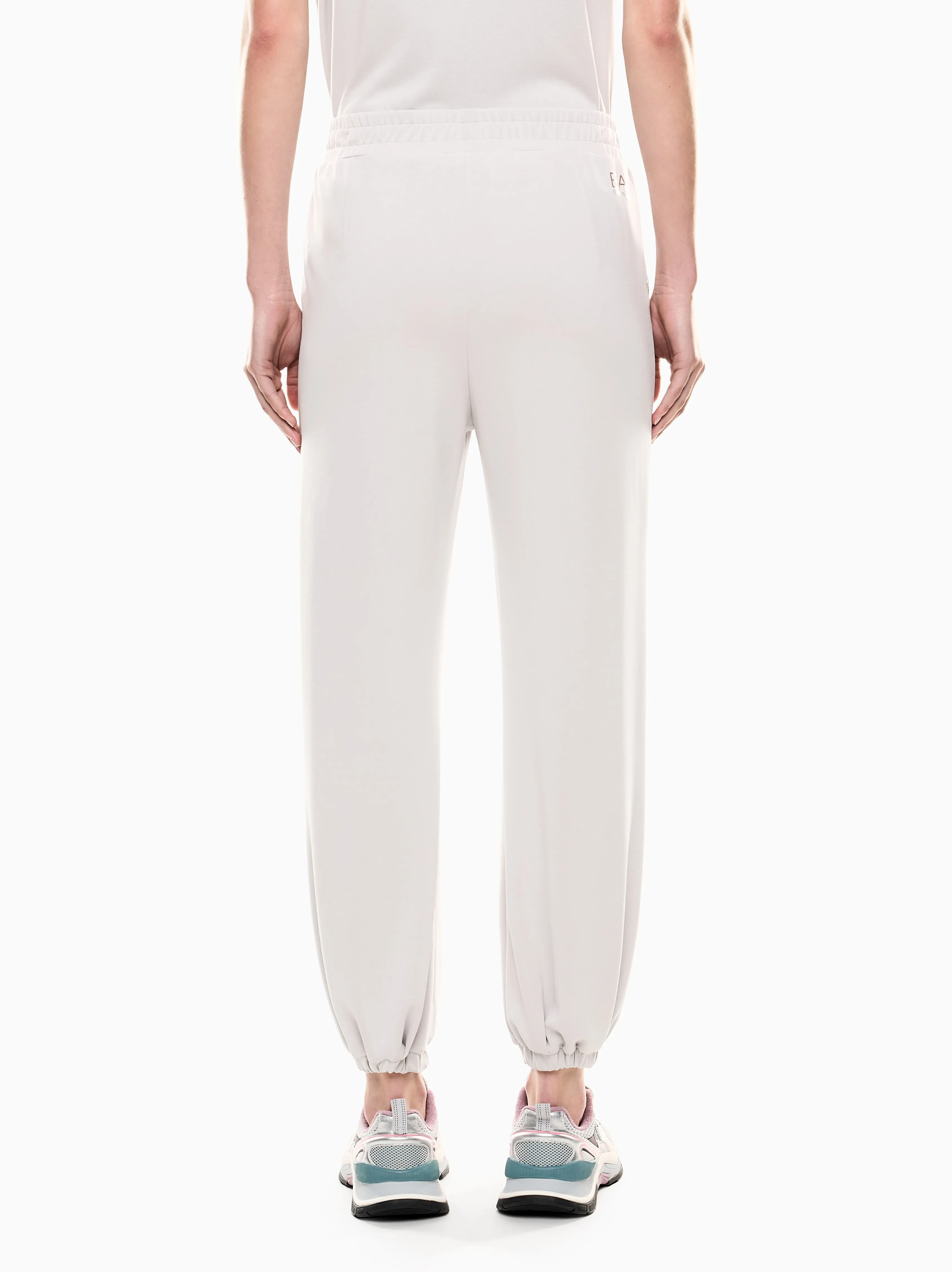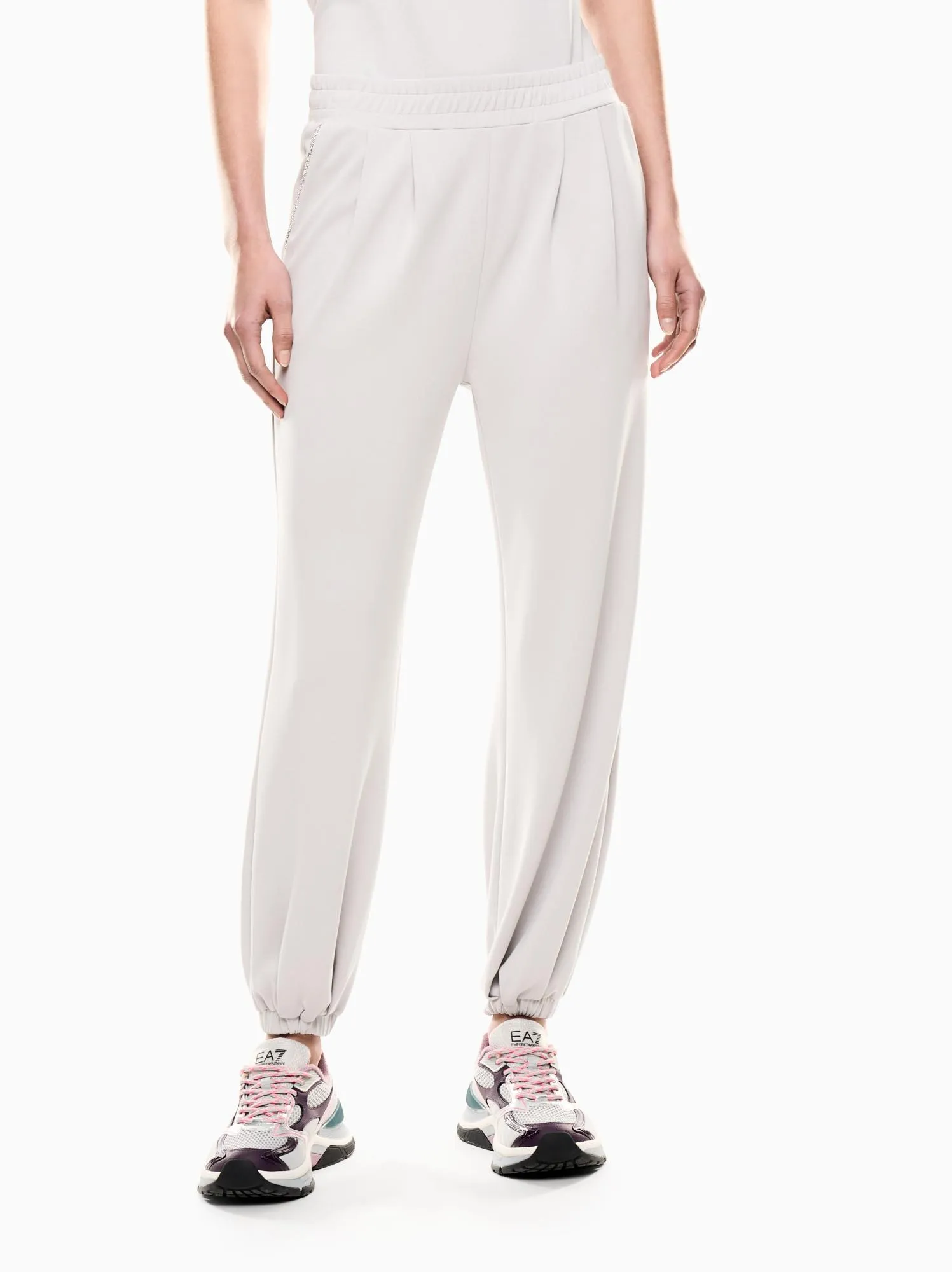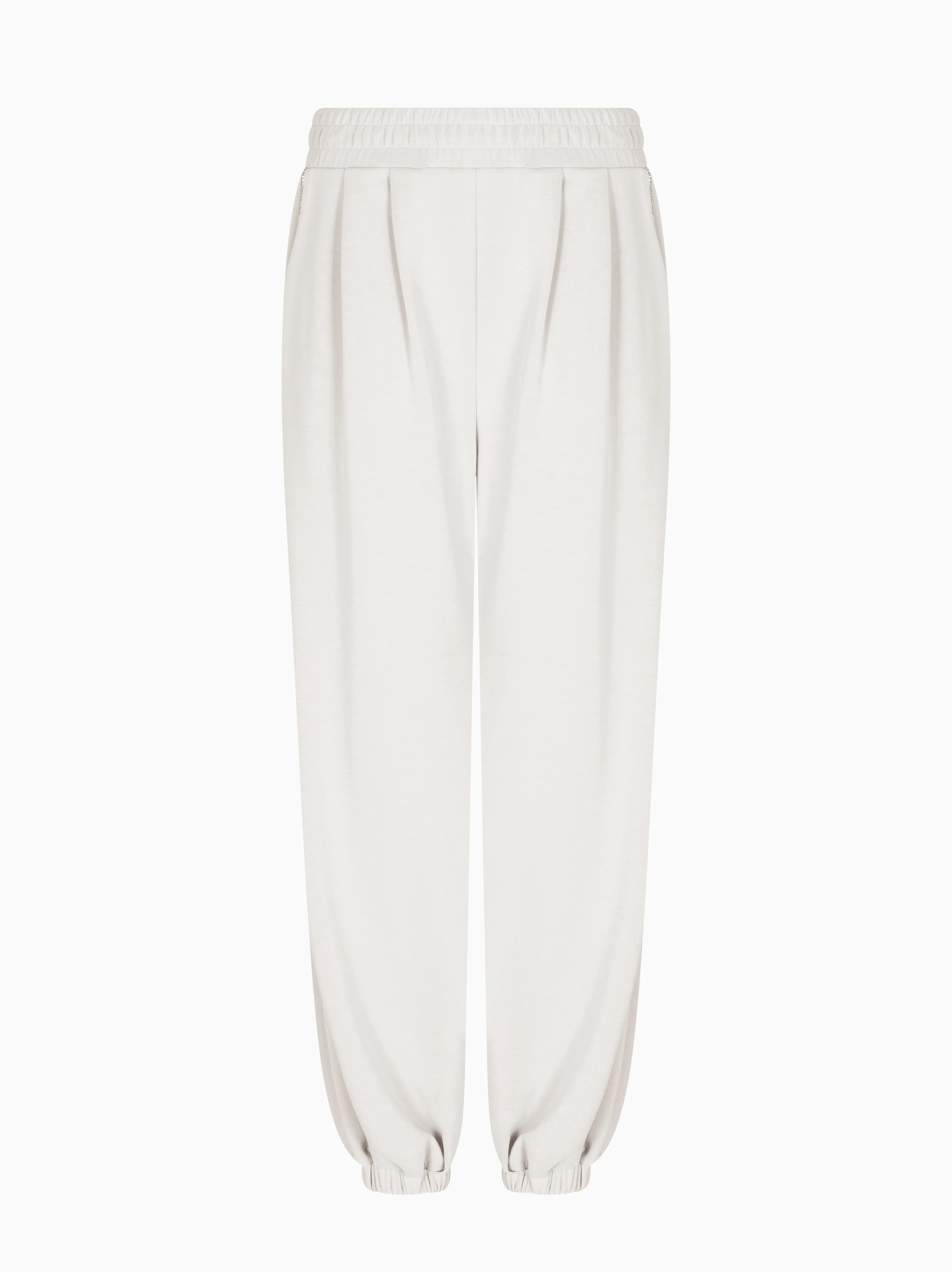 Женские джоггеры с лаконичным силуэтом украшены стразами по линии боковых карманов, добавляющими лёгкий блеск. Оверсайз-крой с манжетами, средняя посадка и эластичный пояс обеспечивают комфорт. Модель выполнена из эластичного модального интерлока, подходящего как для тренировок, так и для отдыха.