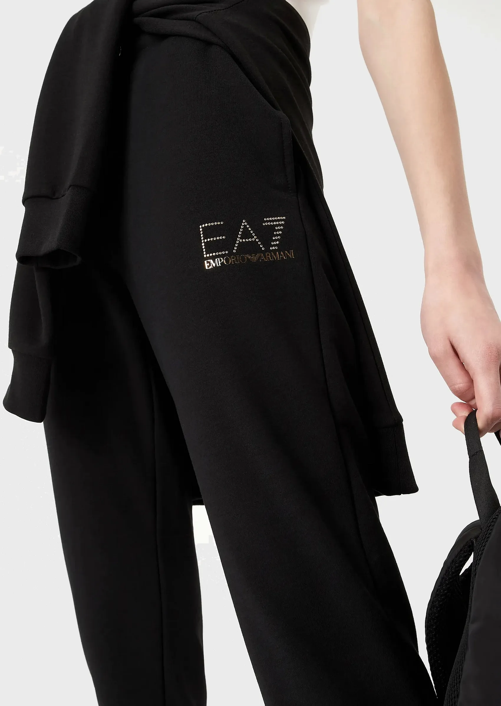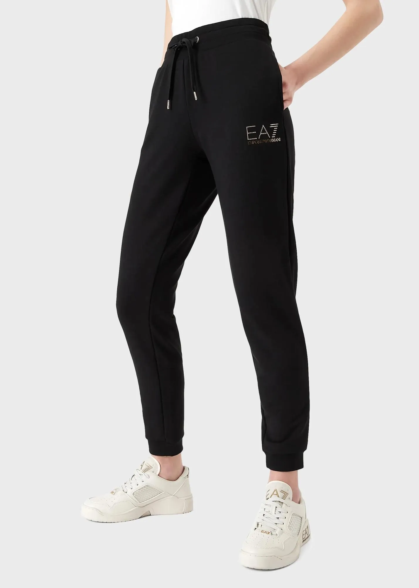 Женские флисовые спортивные брюки из коллекции EA7 с облегающим кроем. Талия регулируется с помощью кулиски, боковые карманы. Украшены логотипом бренда из золотистых страз. Выполнены из хлопкового джерси с легким флисовым покрытием.