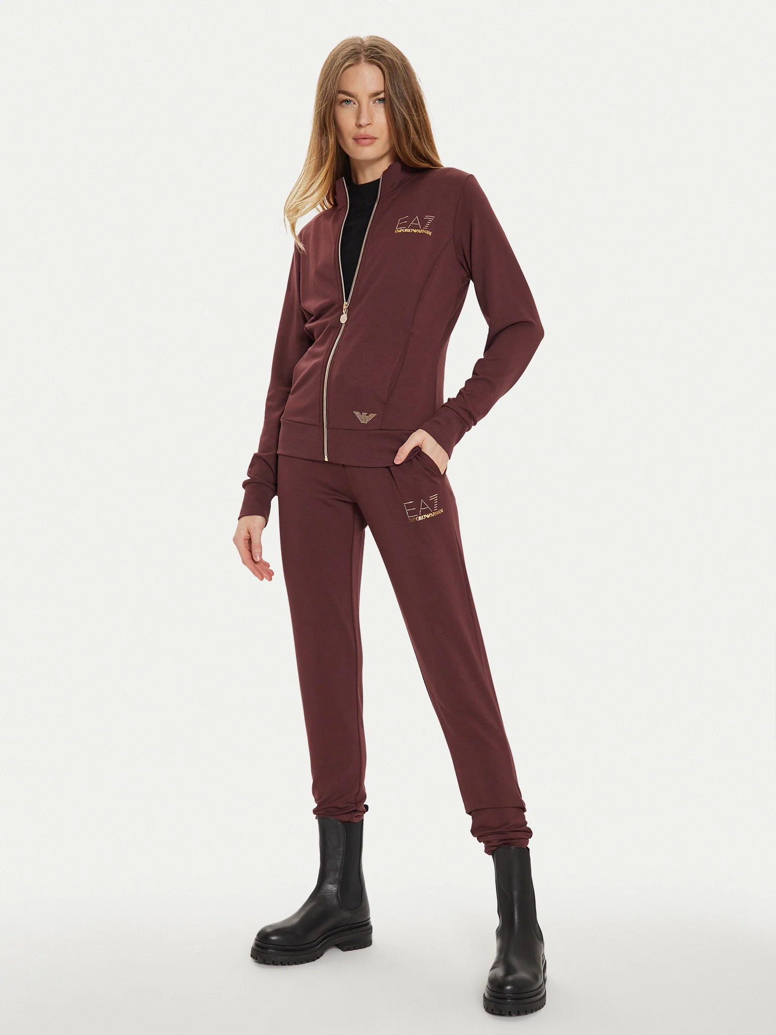 Женские флисовые спортивные брюки из коллекции EA7 с облегающим кроем. Талия регулируется с помощью кулиски, боковые карманы. Украшены логотипом бренда из золотистых страз. Выполнены из хлопкового джерси с легким флисовым покрытием.