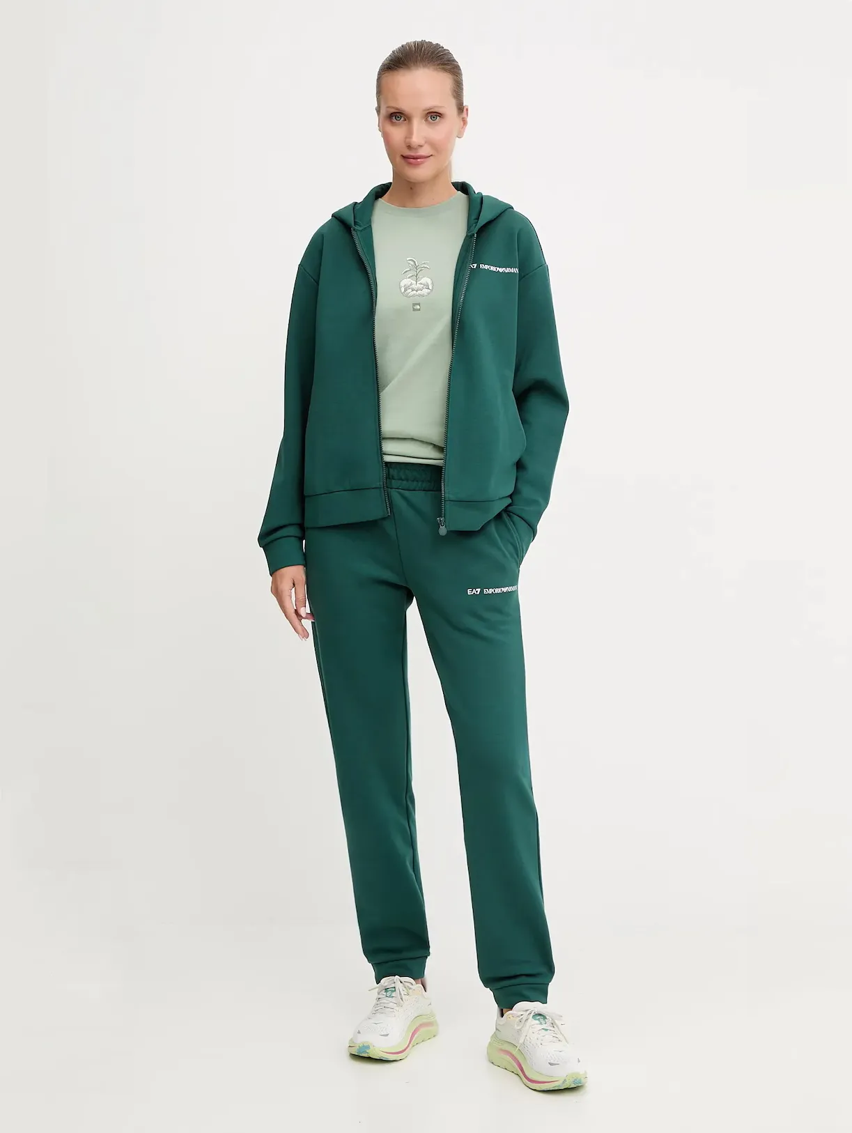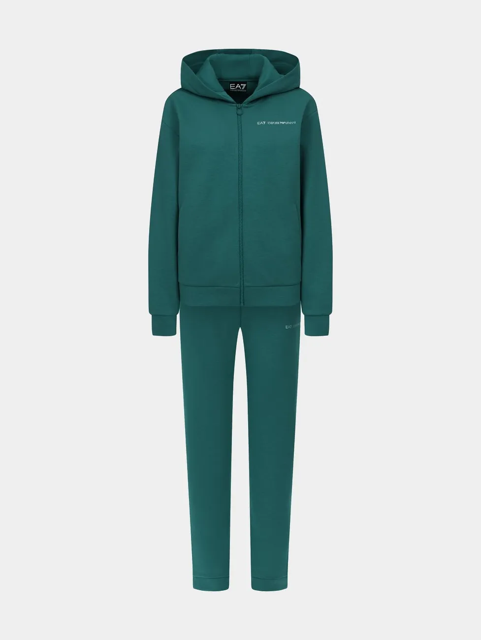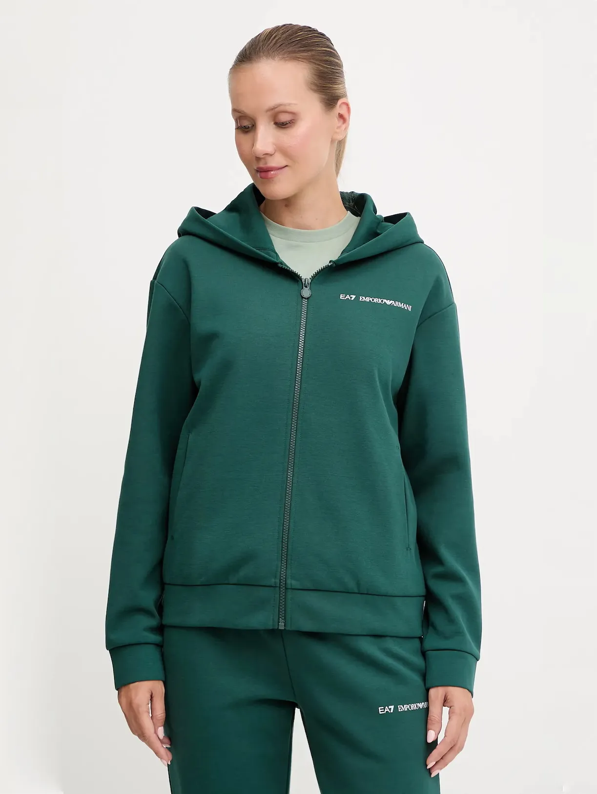 Женский спортивный костюм EA7 Emporio Armani темно-зеленого цвета сочетает комфорт и современный стиль. Толстовка прямого кроя с капюшоном и застёжкой на молнию оснащена боковыми карманами, эластичными манжетами и подолом. Брюки зауженного кроя с манжетами и боковыми карманами, создают гармоничный и удобный комплект для тренировок, прогулок и повседневных образов.