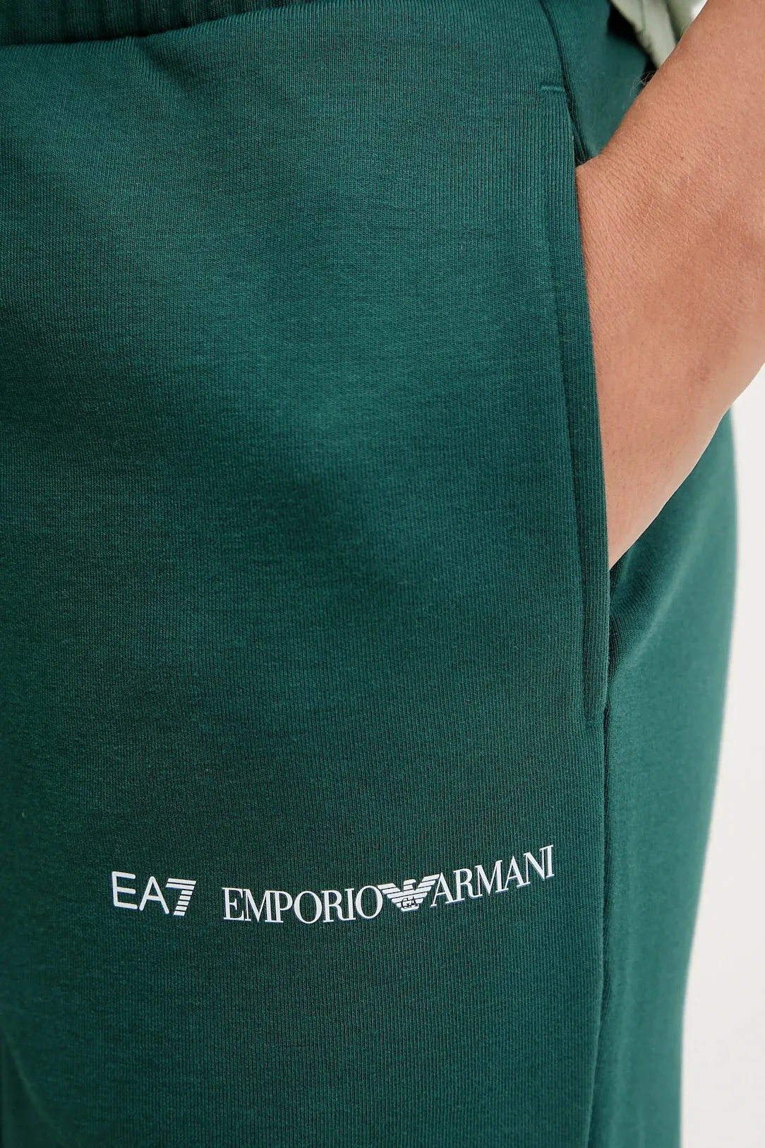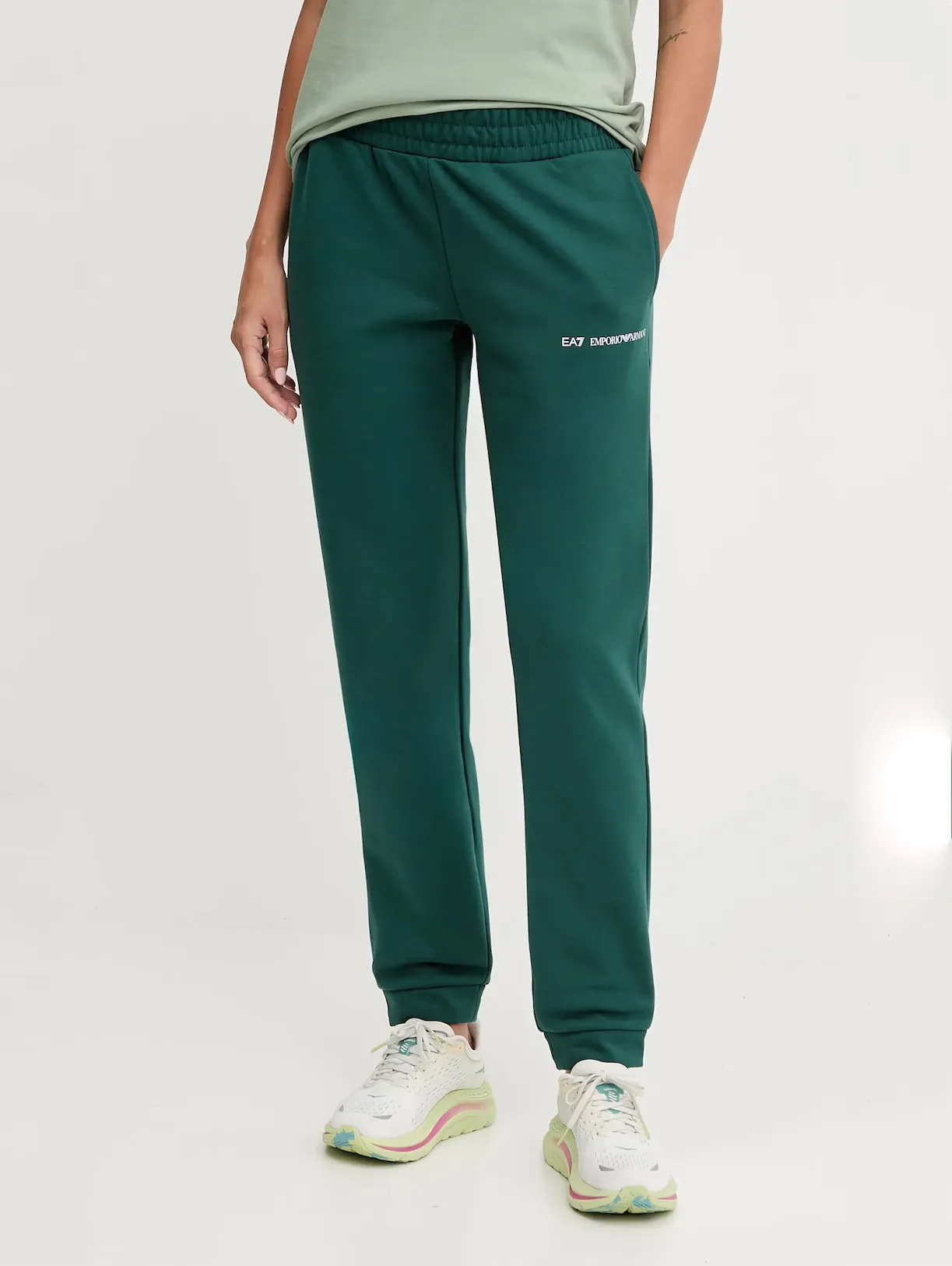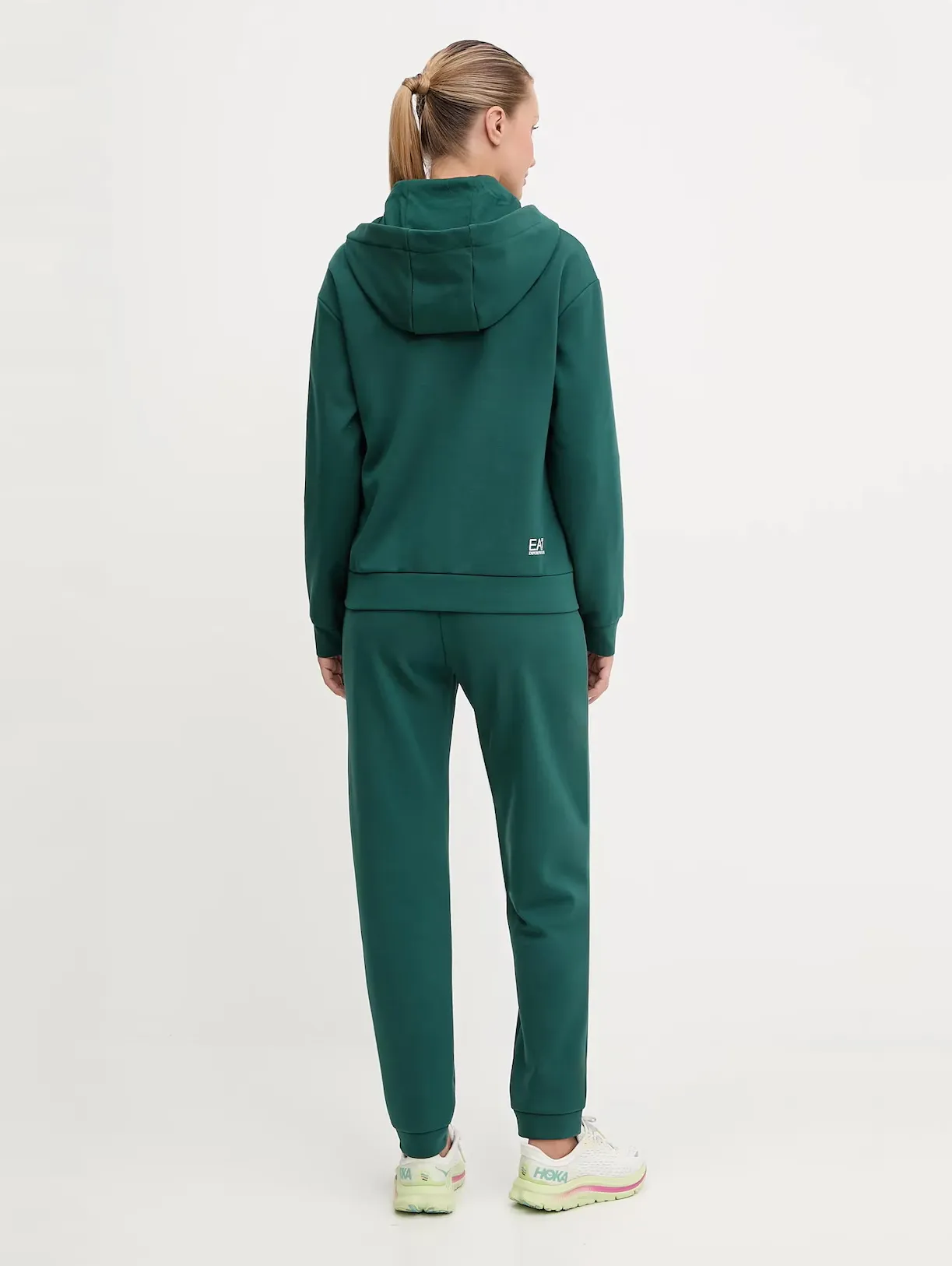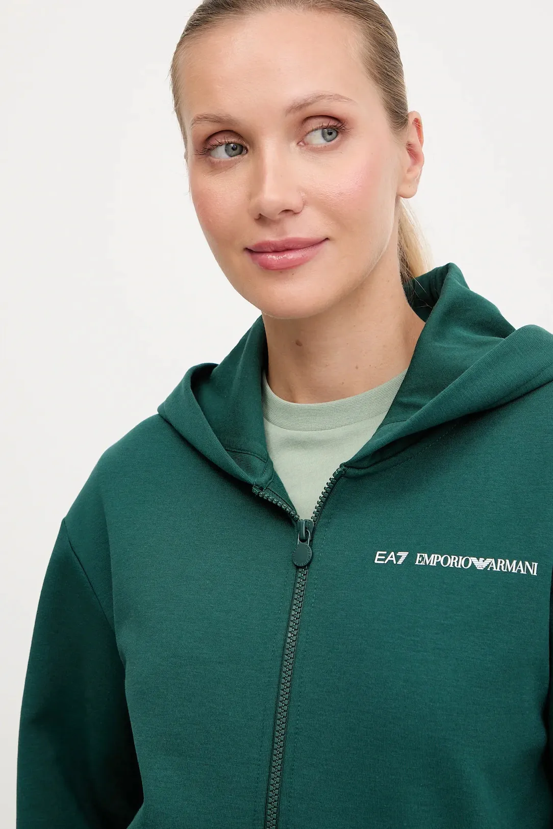 Женский спортивный костюм EA7 Emporio Armani темно-зеленого цвета сочетает комфорт и современный стиль. Толстовка прямого кроя с капюшоном и застёжкой на молнию оснащена боковыми карманами, эластичными манжетами и подолом. Брюки зауженного кроя с манжетами и боковыми карманами, создают гармоничный и удобный комплект для тренировок, прогулок и повседневных образов.