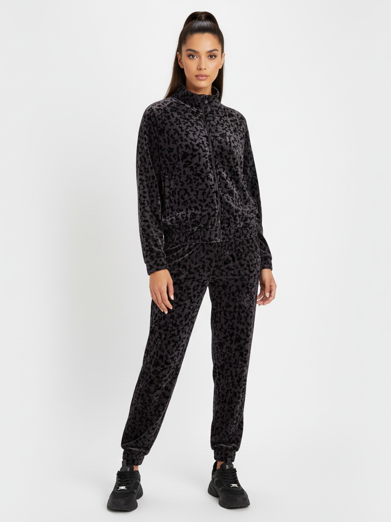 Женский спортивный костюм из коллекции Graphic Series выполнен с эффектным анималистичным принтом и создан для тех, кто выбирает яркие образы без компромиссов в комфорте. Толстовка на молнии с боковыми карманами и зауженные джоггеры с манжетами и регулируемым поясом обеспечивают свободу движений. Мягкая эластичная ткань делает комплект идеальным для спорта, путешествий и повседневной носки.