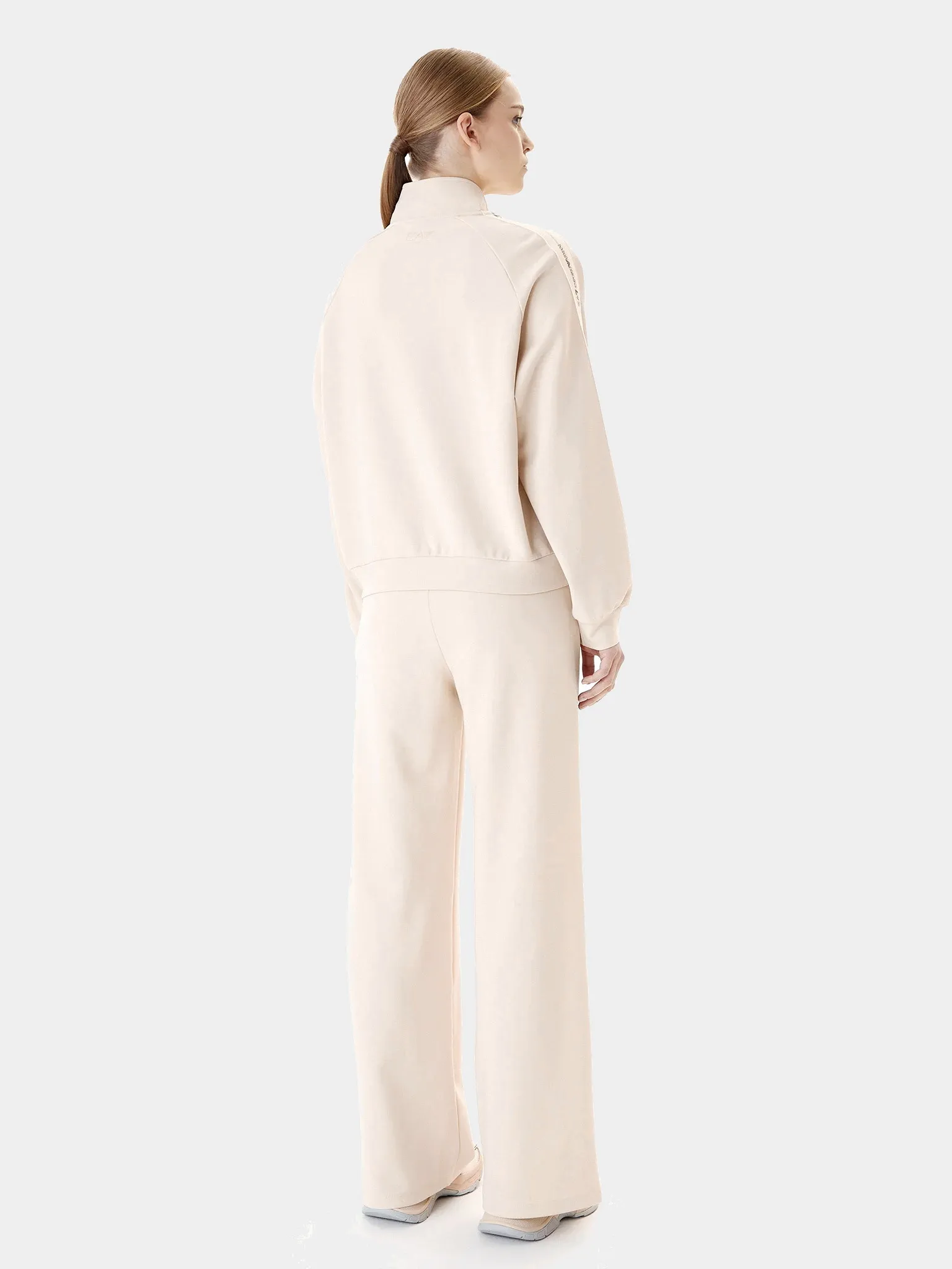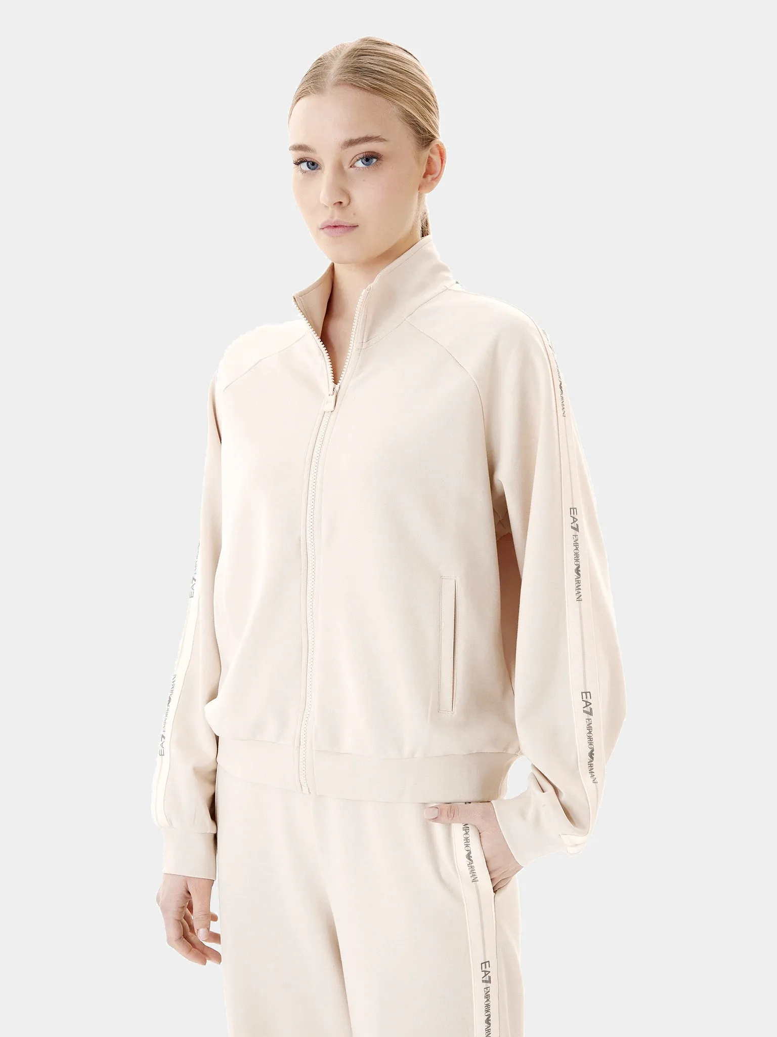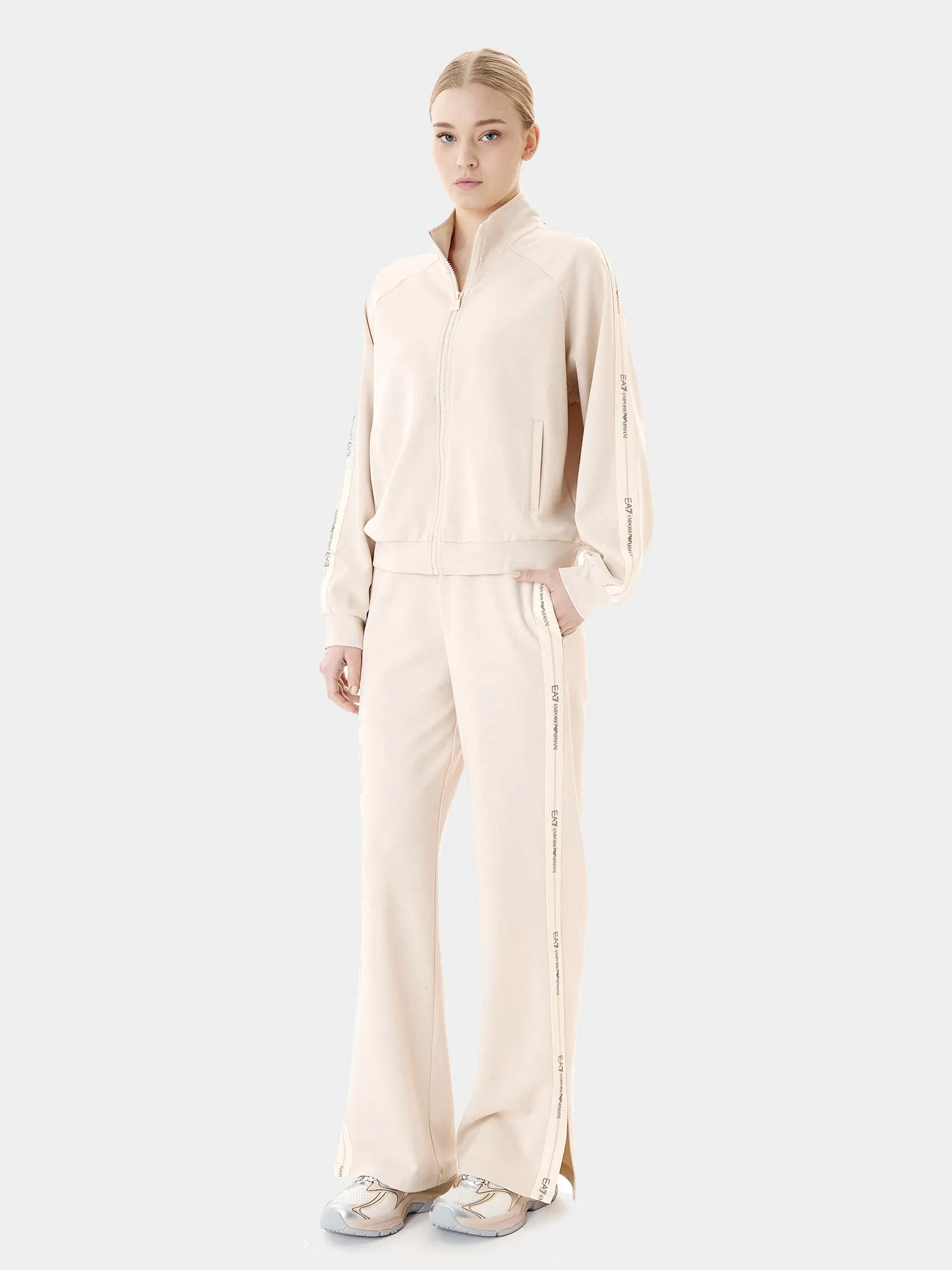Женский универсальный спортивный костюм из эластичной ткани включает толстовку на молнии и брюки свободного кроя. Модель украшена контрастным логотипом бренда и фирменной лентой на рукавах толстовки и по бокам брюк. Толстовка оснащена боковыми карманами, брюки — эластичным поясом и двумя боковыми карманами. Идеально подходит для тренировок и активного отдыха.