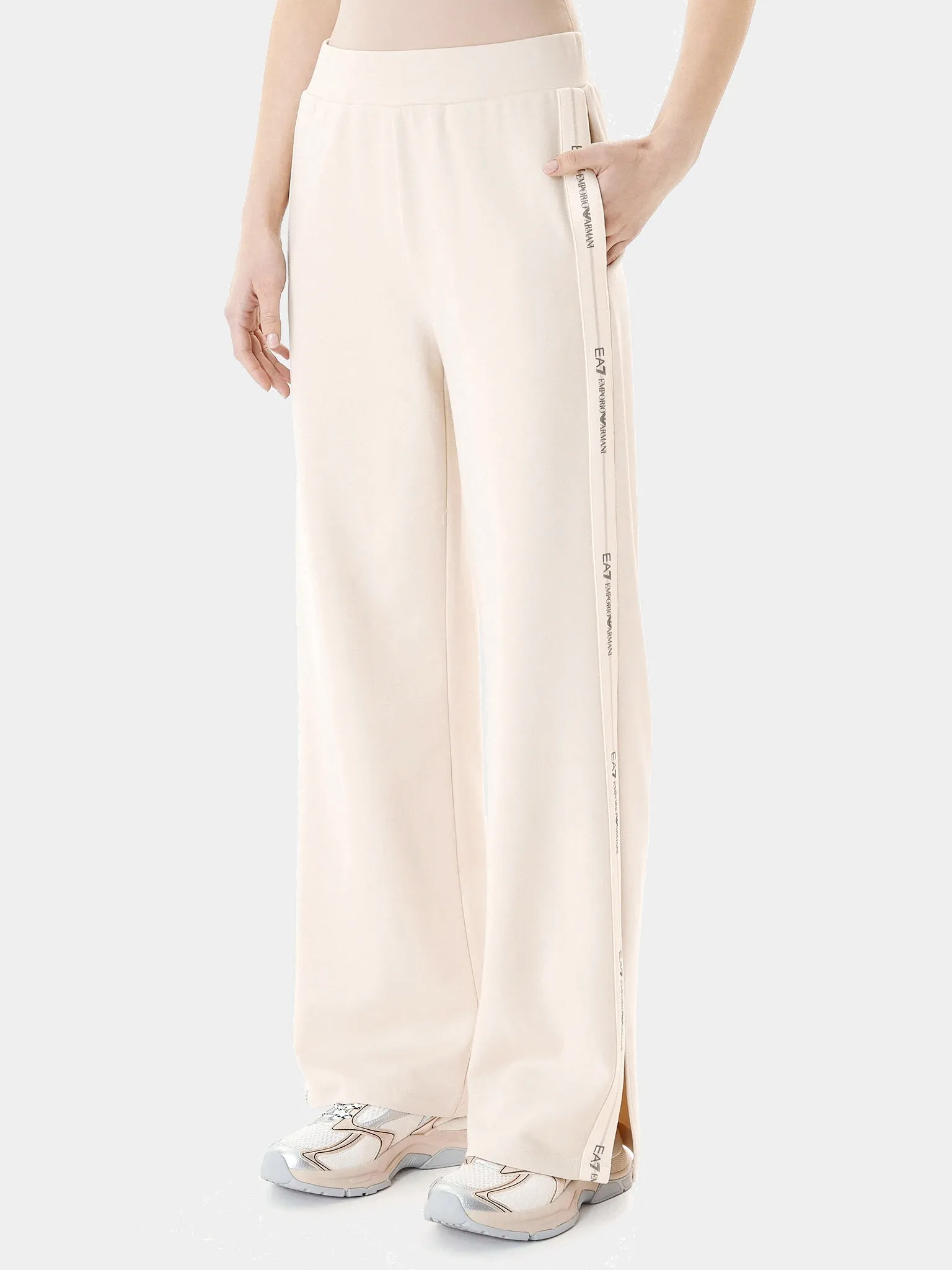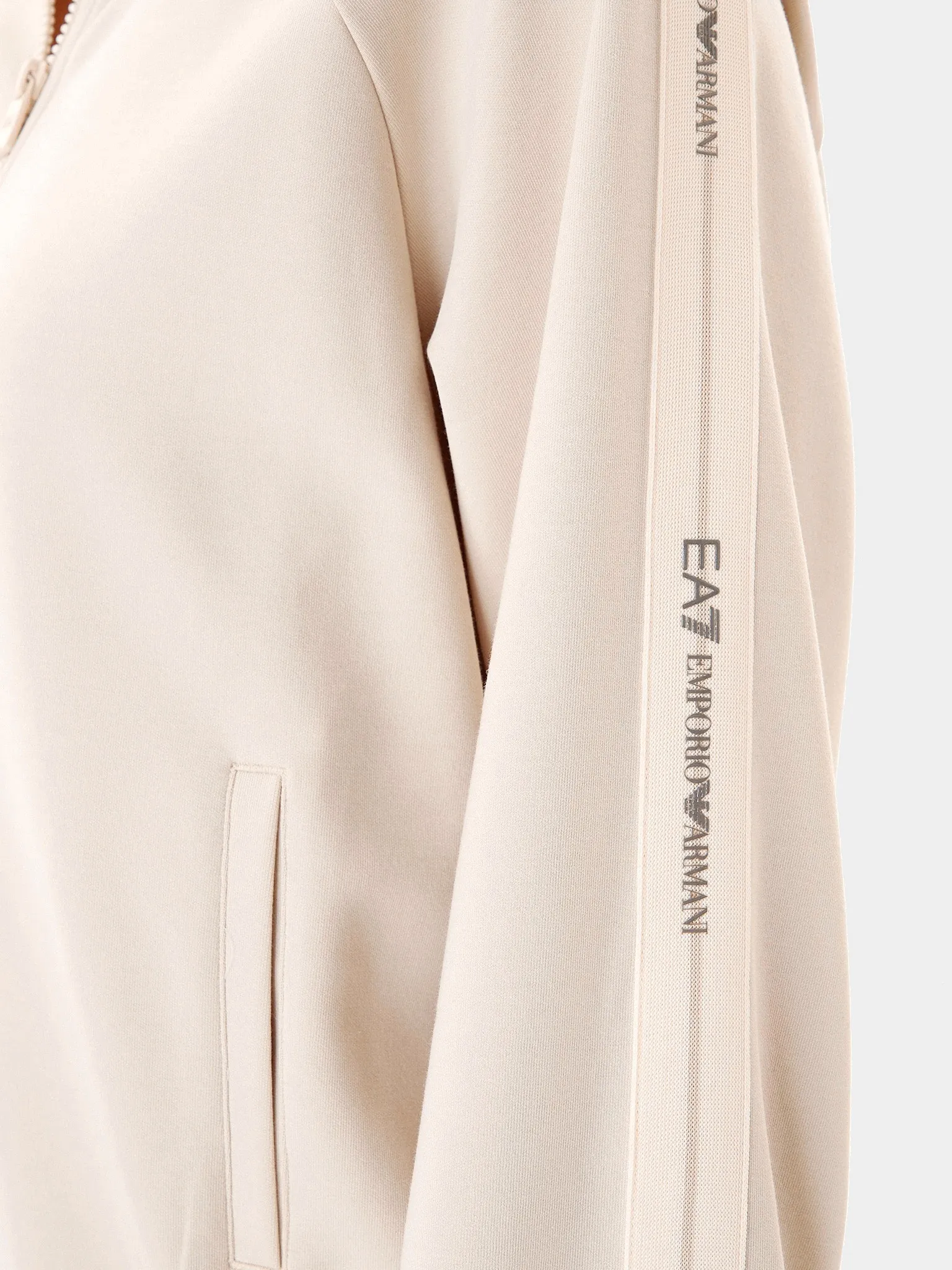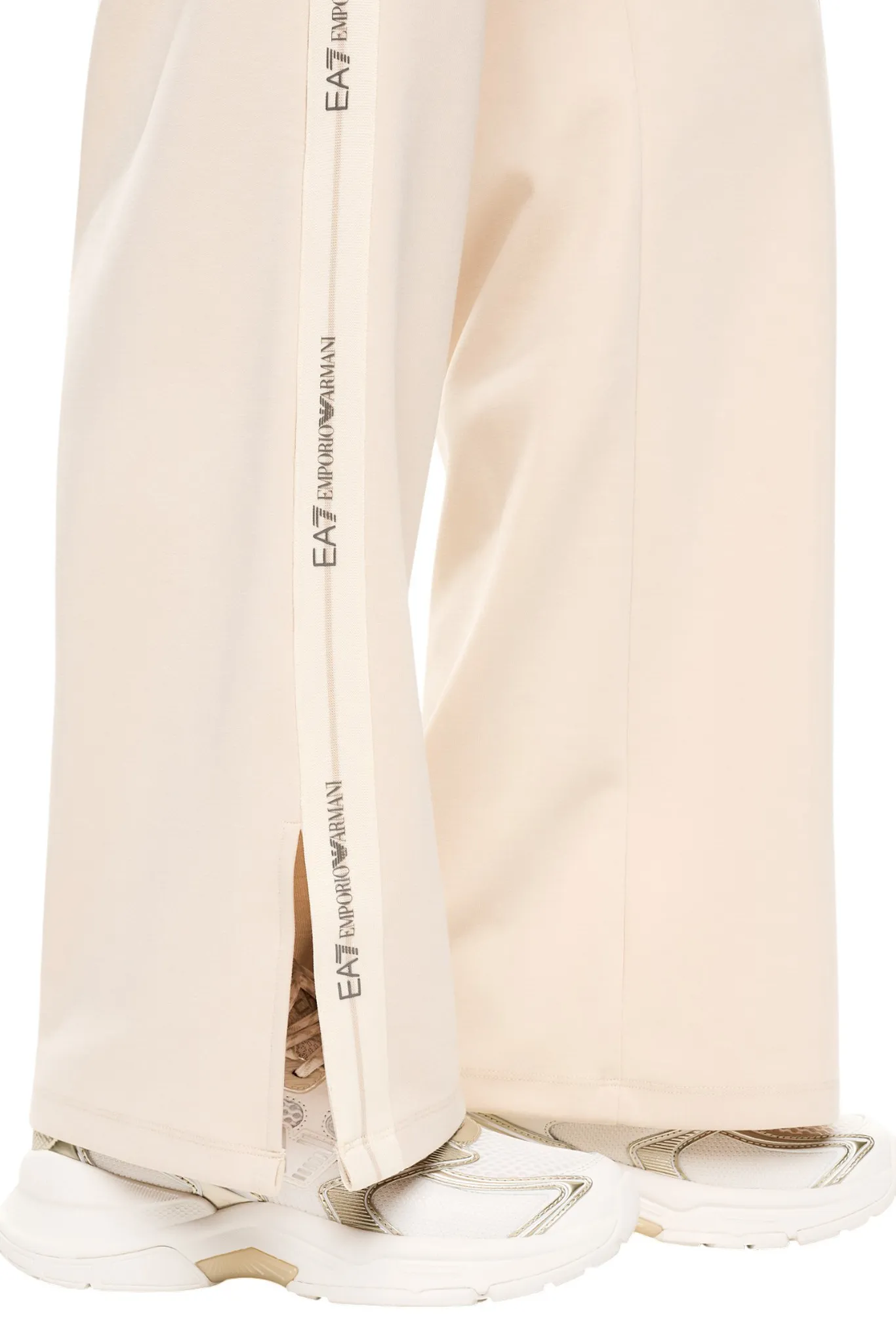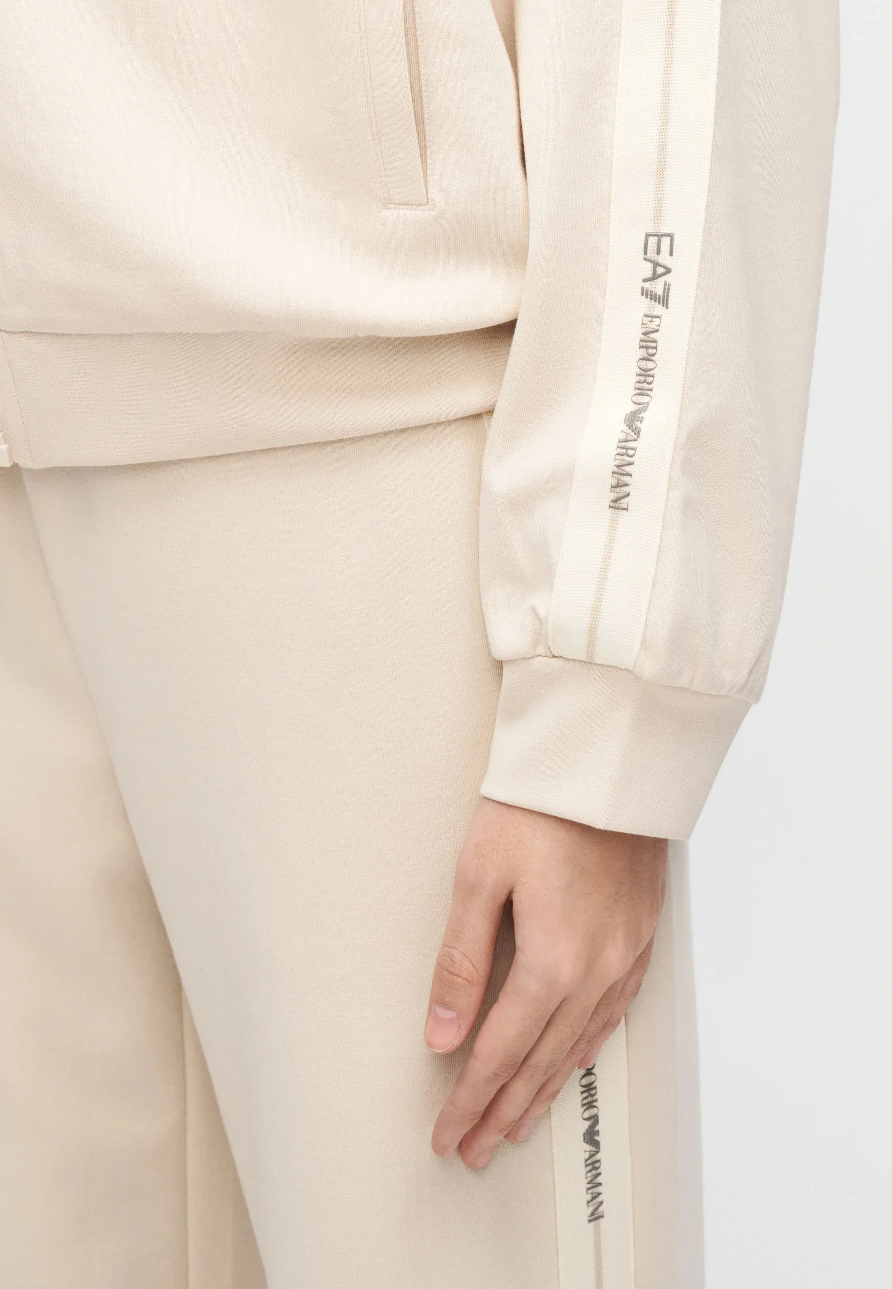 Женский универсальный спортивный костюм из эластичной ткани включает толстовку на молнии и брюки свободного кроя. Модель украшена контрастным логотипом бренда и фирменной лентой на рукавах толстовки и по бокам брюк. Толстовка оснащена боковыми карманами, брюки — эластичным поясом и двумя боковыми карманами. Идеально подходит для тренировок и активного отдыха.