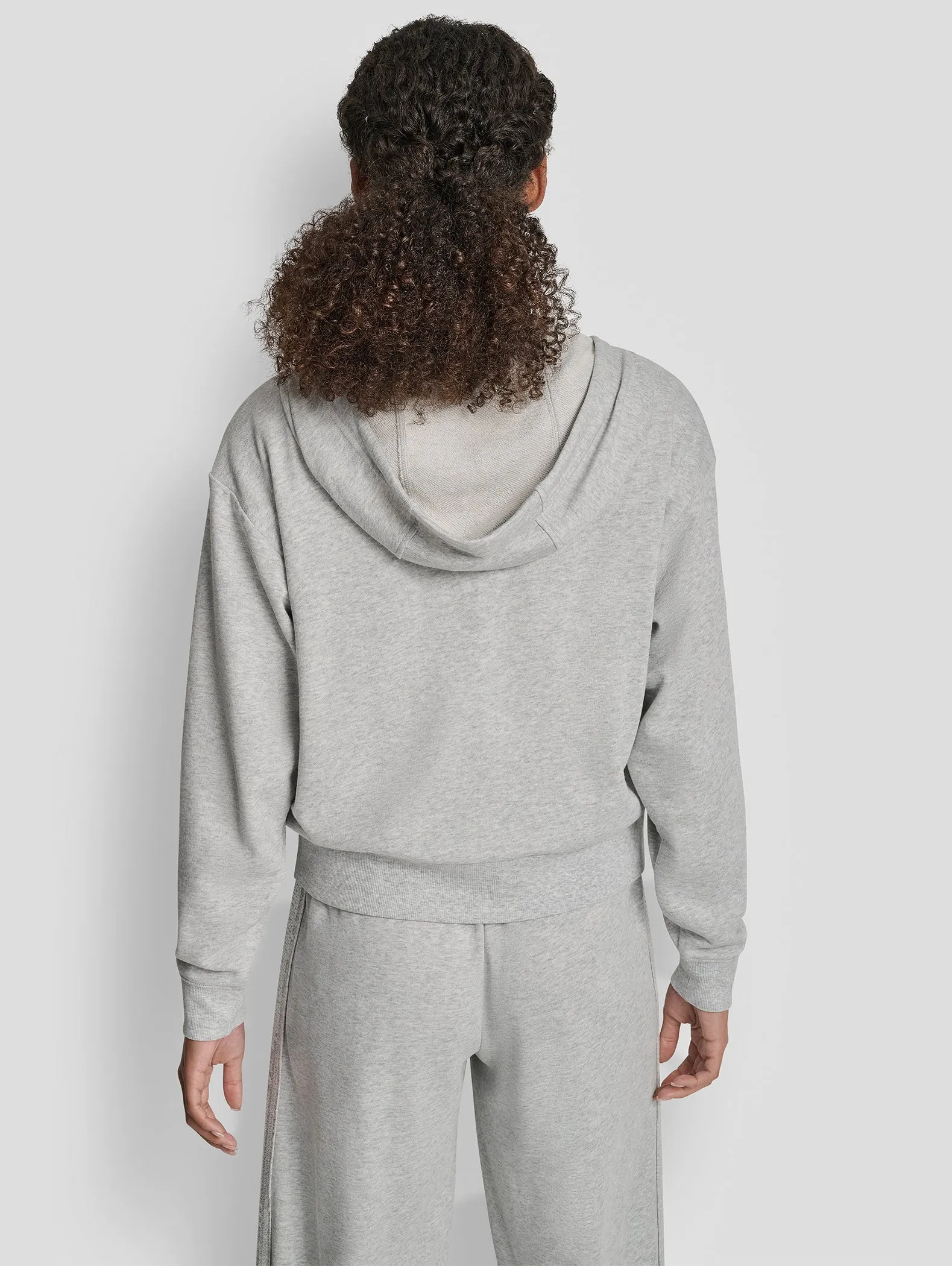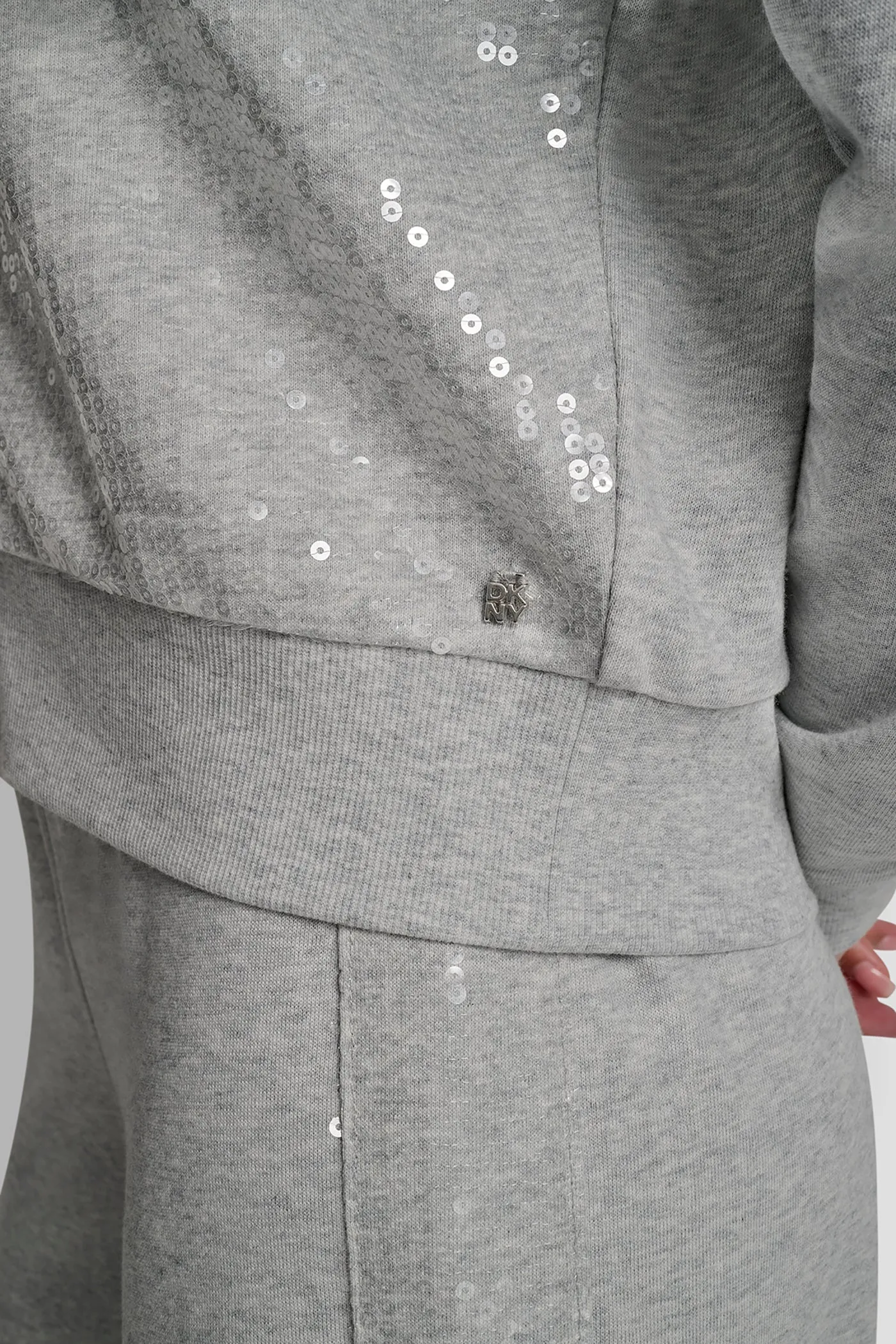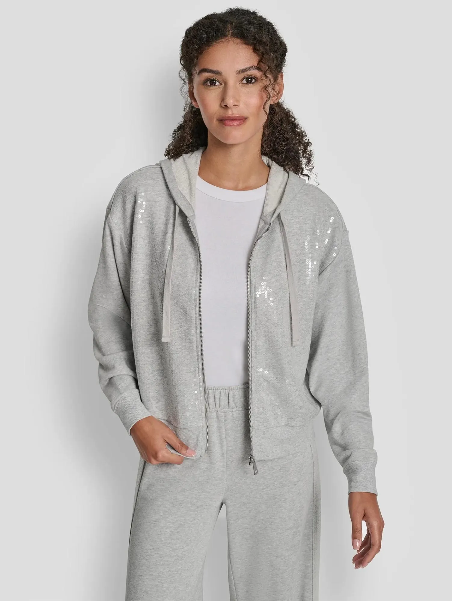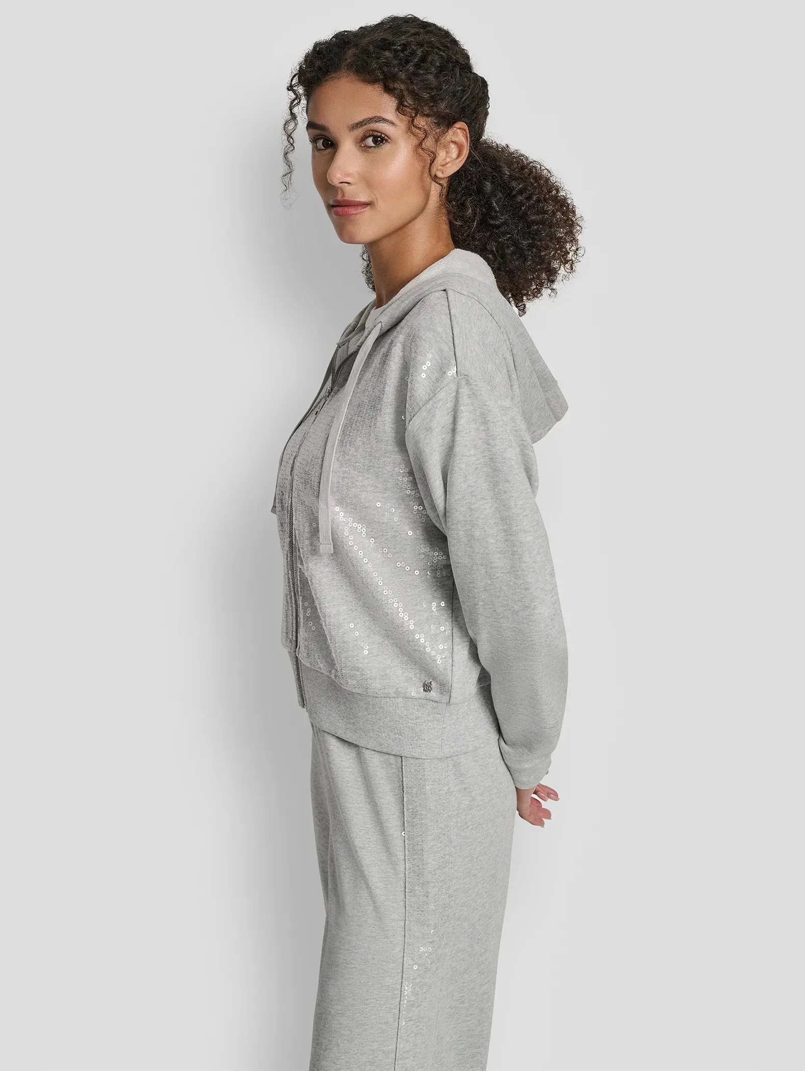Женская толстовка с капюшоном из хлопка и полиэстера — стильная и комфортная модель для повседневных образов. Мягкая ткань из французского трикотажа (футера) хорошо держит форму. Модель с капюшоном и застёжкой на молнии дополнена эффектным декором из пайеток спереди. Отлично сочетается с брюками из коллекции.
