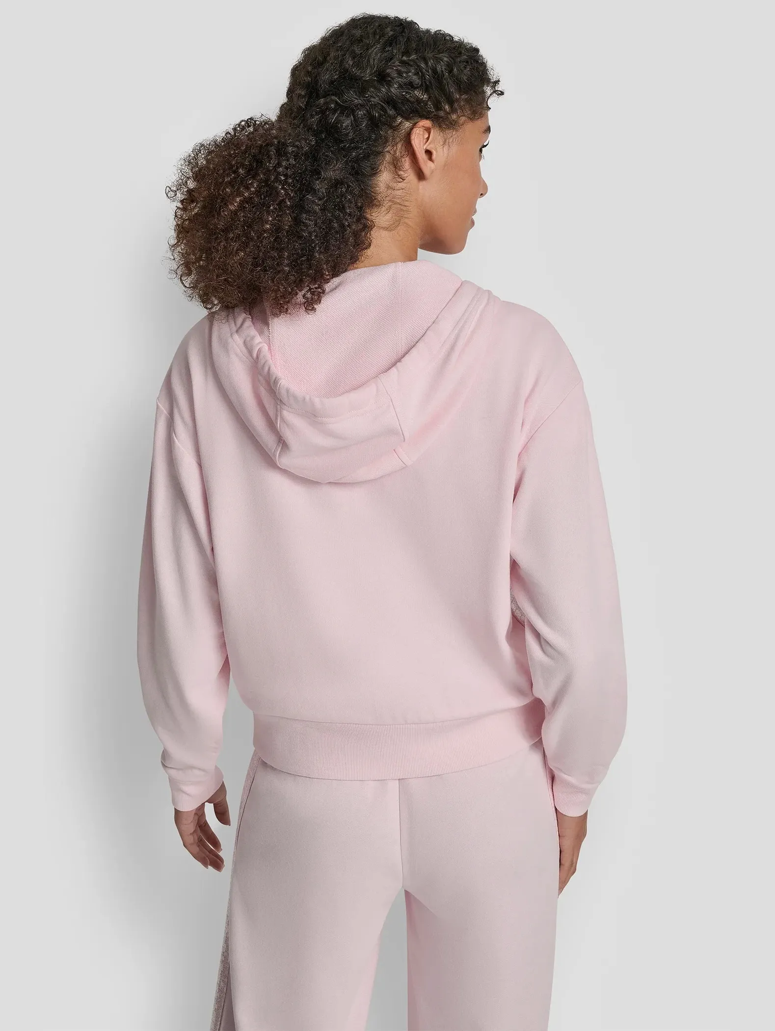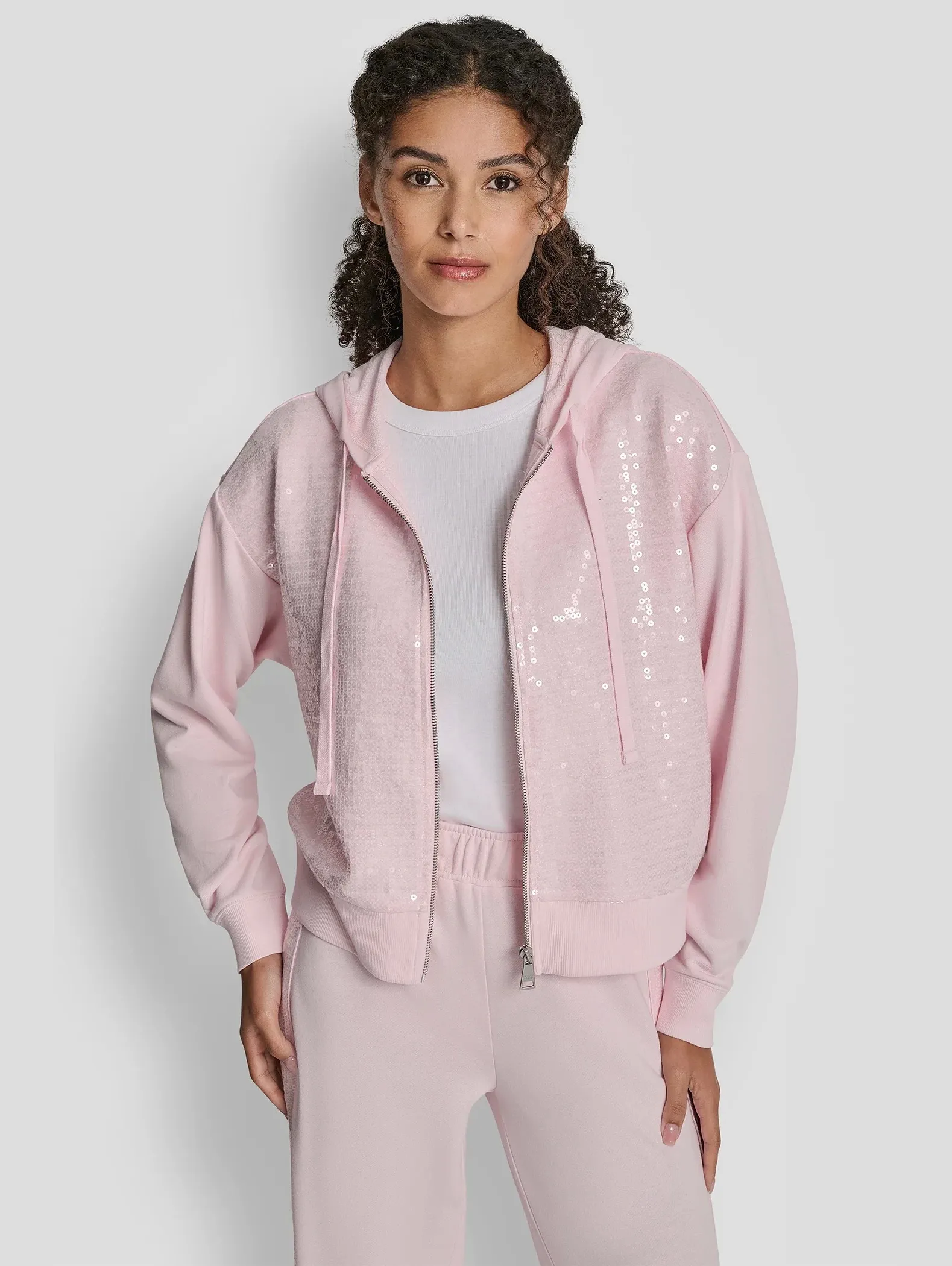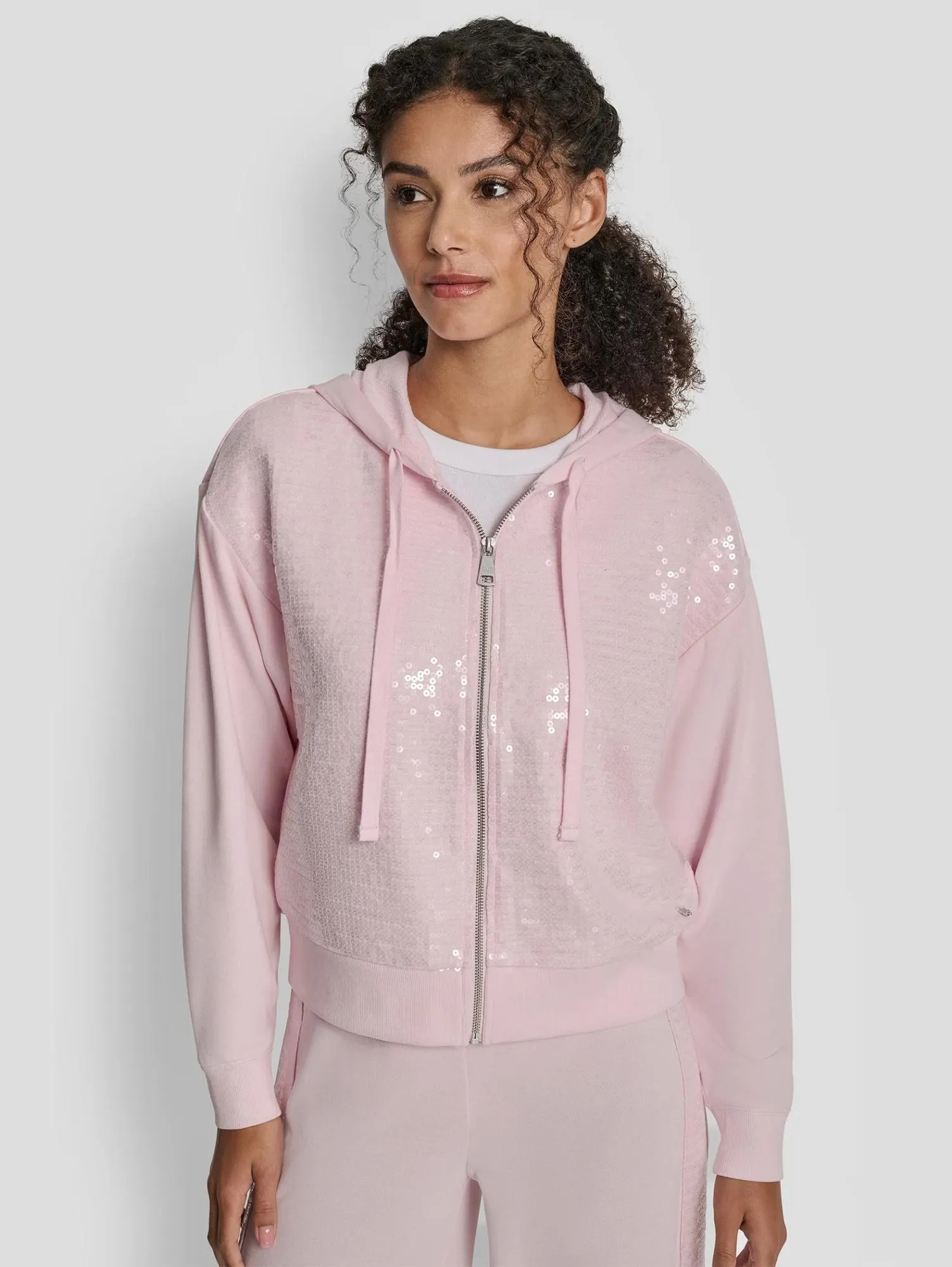 Женская толстовка с капюшоном из хлопка и полиэстера — стильная и комфортная модель для повседневных образов. Мягкая ткань из французского трикотажа (футера) хорошо держит форму. Модель с капюшоном и застёжкой на молнии дополнена эффектным декором из пайеток спереди. Отлично сочетается с брюками из коллекции.