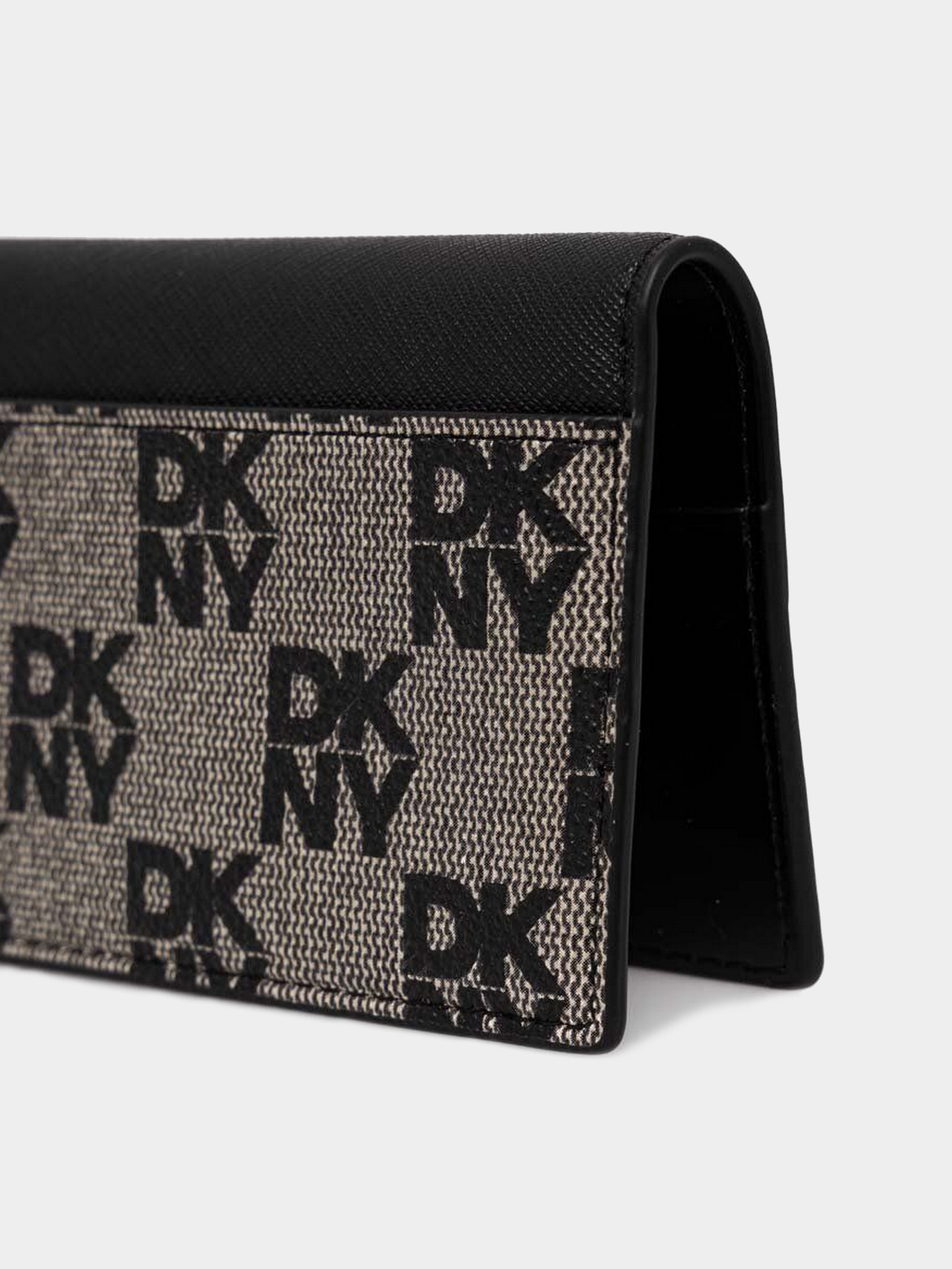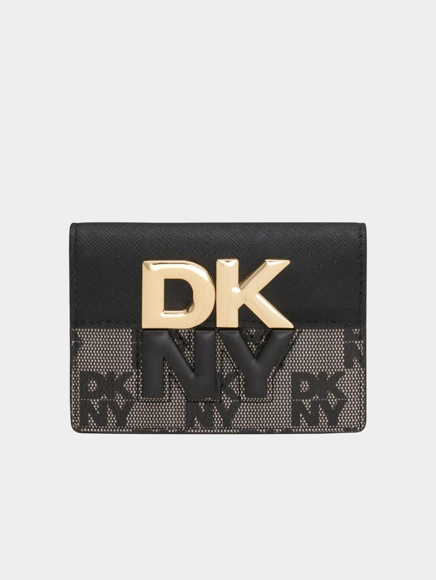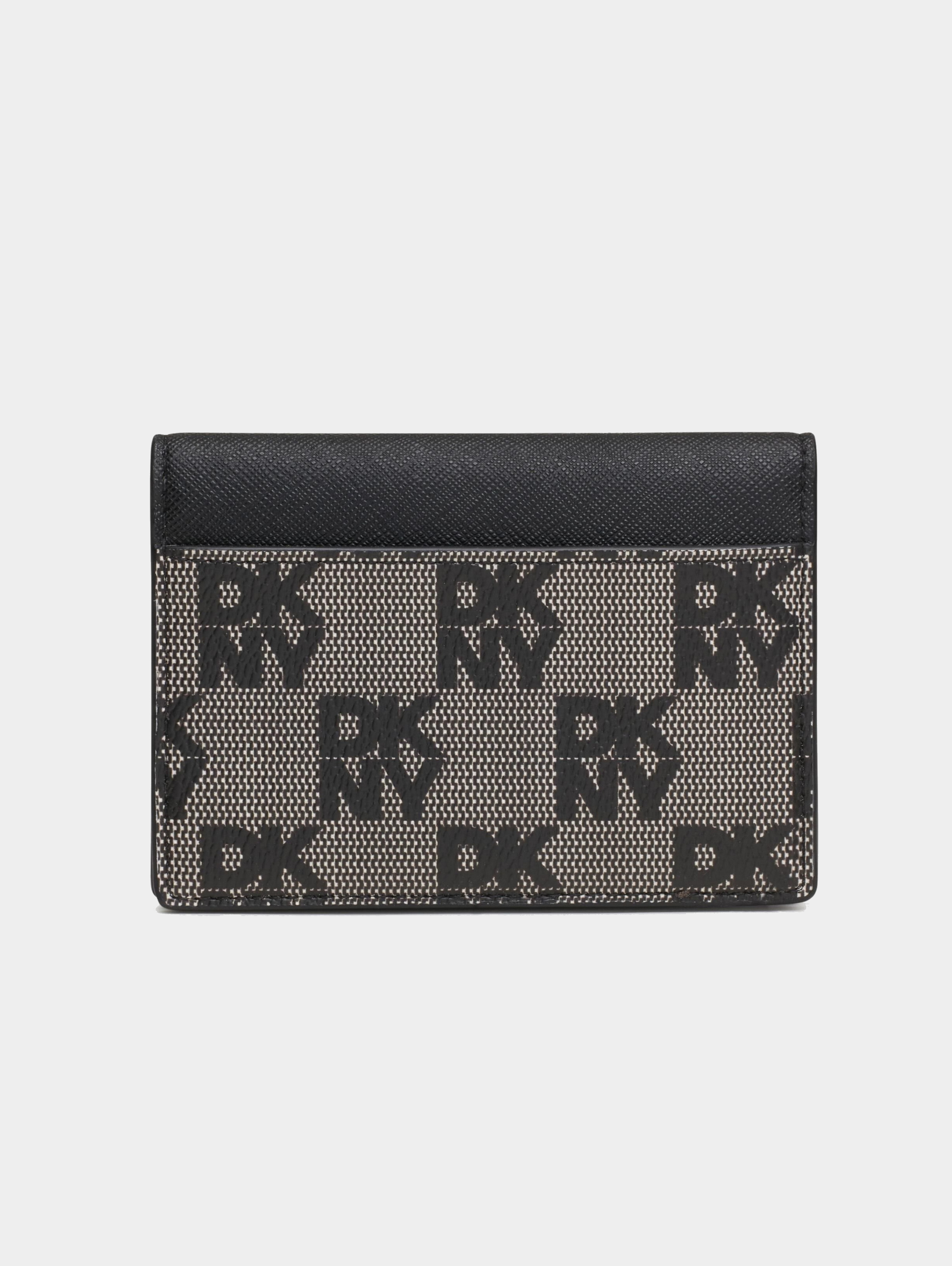 Визитница от бренда DKNY, выполнена из комбинации синтетического материала и натуральной кожи.