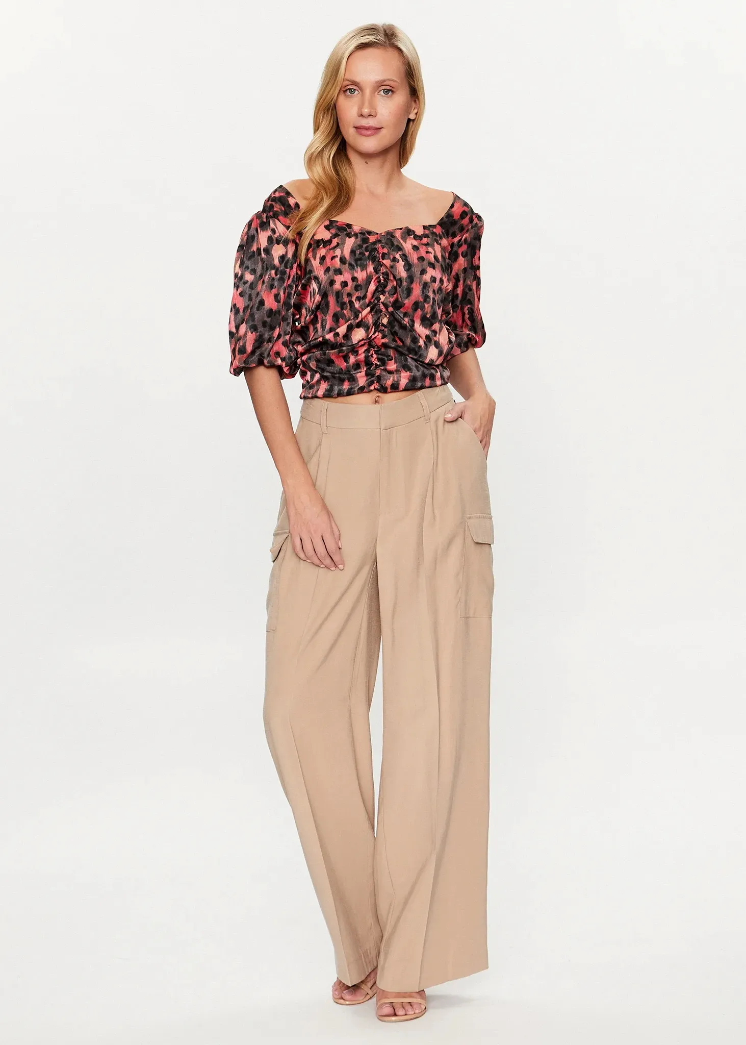 Яркий топ от бренда DKNY, топ с открытыми плечами и приоткрытой спиной, рукава 3/4, облегающий сзади и присобраный спереди. Летняя и элегантная модель.