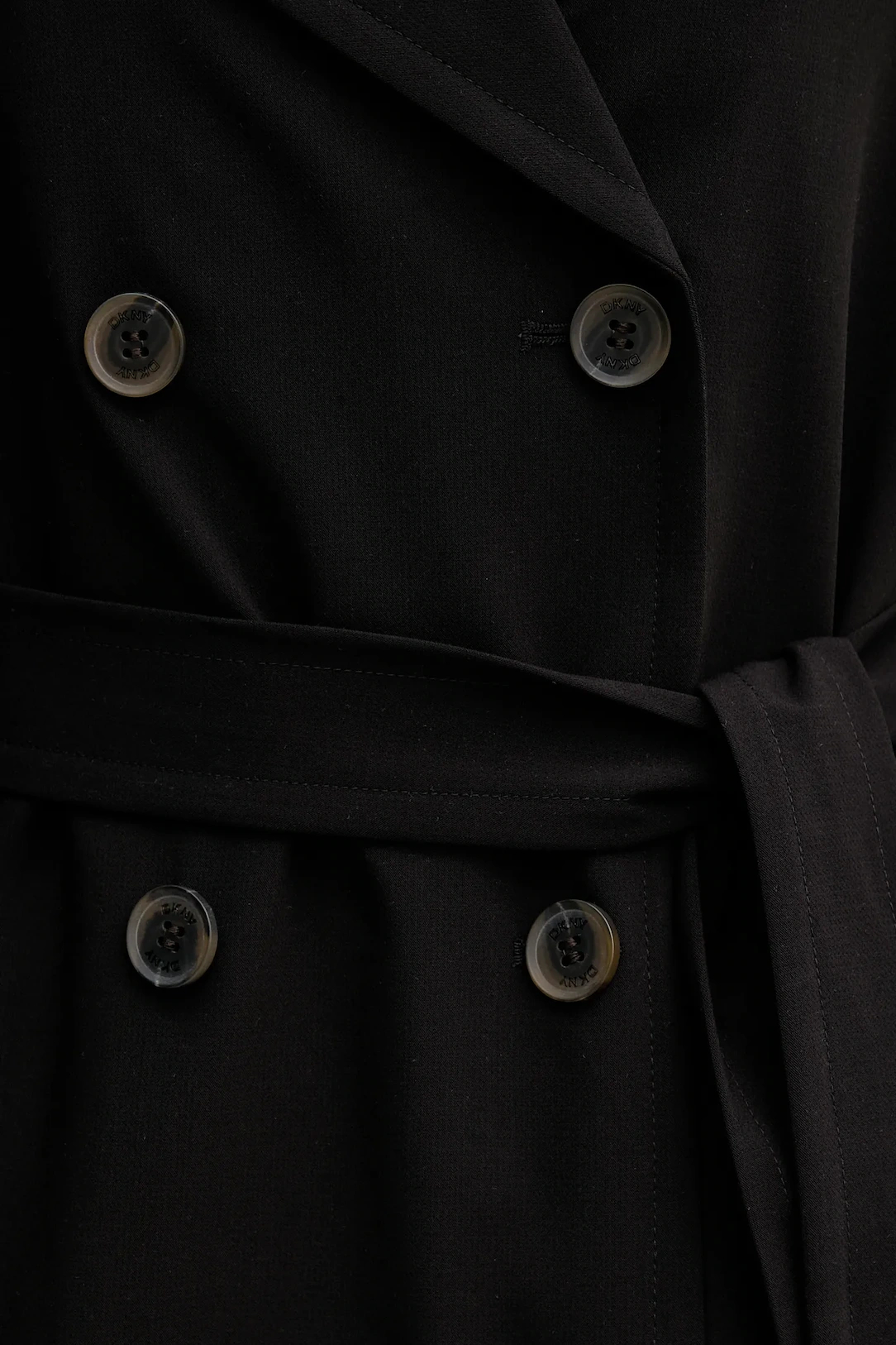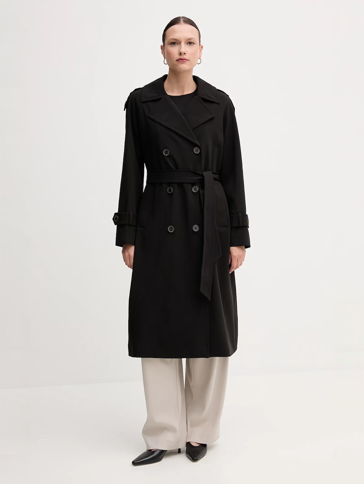 Женский тренч DKNY ниже колен в чёрном цвете — современная классика для городского ритма. Двубортный крой с лацканами, кокетка для защиты от ветра и пояс на талии подчеркивают элегантность. Лёгкая модель без утепления, с подкладкой из полиэстера.
