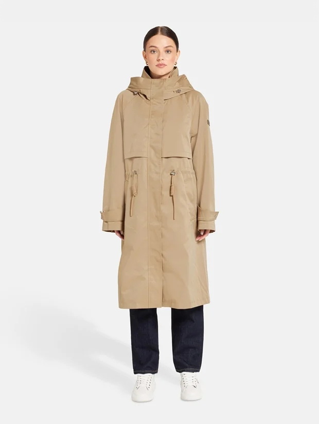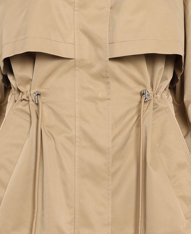 Женский тренч с капюшоном DKNY ниже колен в бежевом цвете — современная классика для городского ритма. Прямой крой с лацканами, ветрозащитная кокетка, эластичный пояс на талии и рукава реглан создают комфортный силуэт. Лёгкая модель без утепления, с подкладкой из полиэстера.