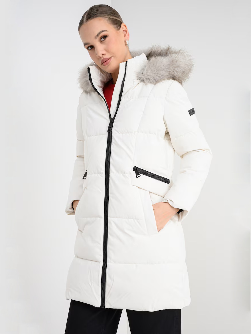 Женская зимняя куртка от DKNY с тёплым съёмным капюшоном. Модель застёгивается на молнию, дополнена внешними карманами и внутренним карманом на молнии. Внутренняя утяжка на поясе позволяет регулировать посадку и подчёркивает силуэт.