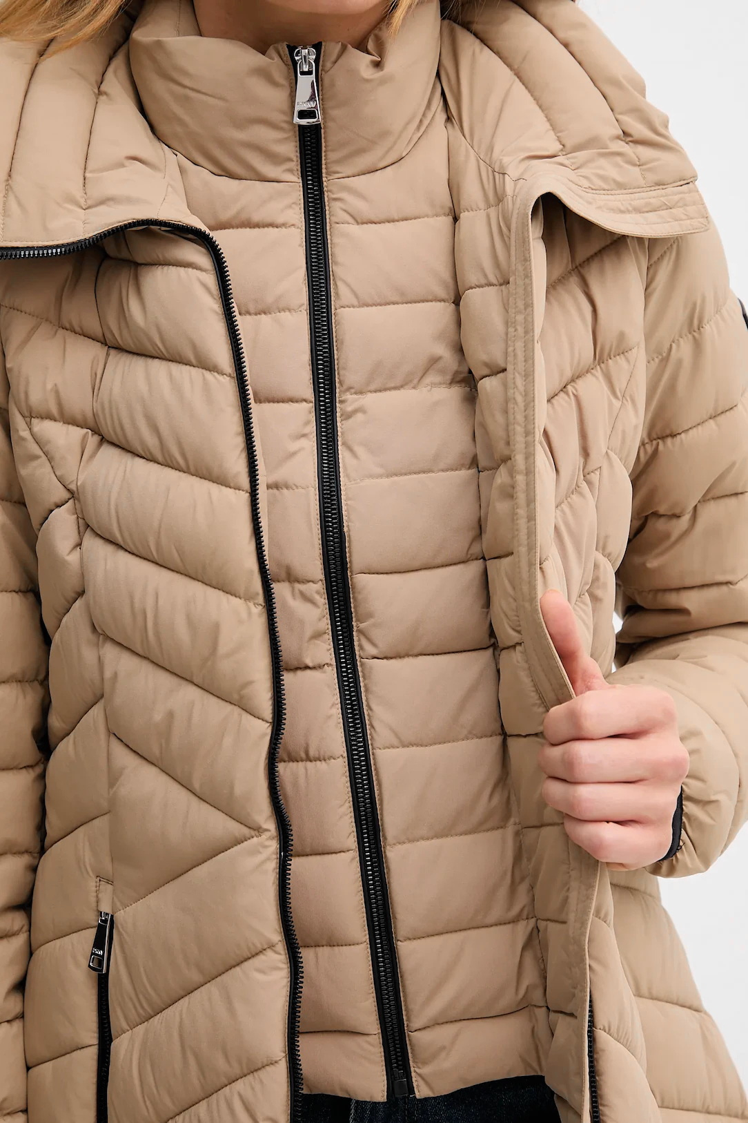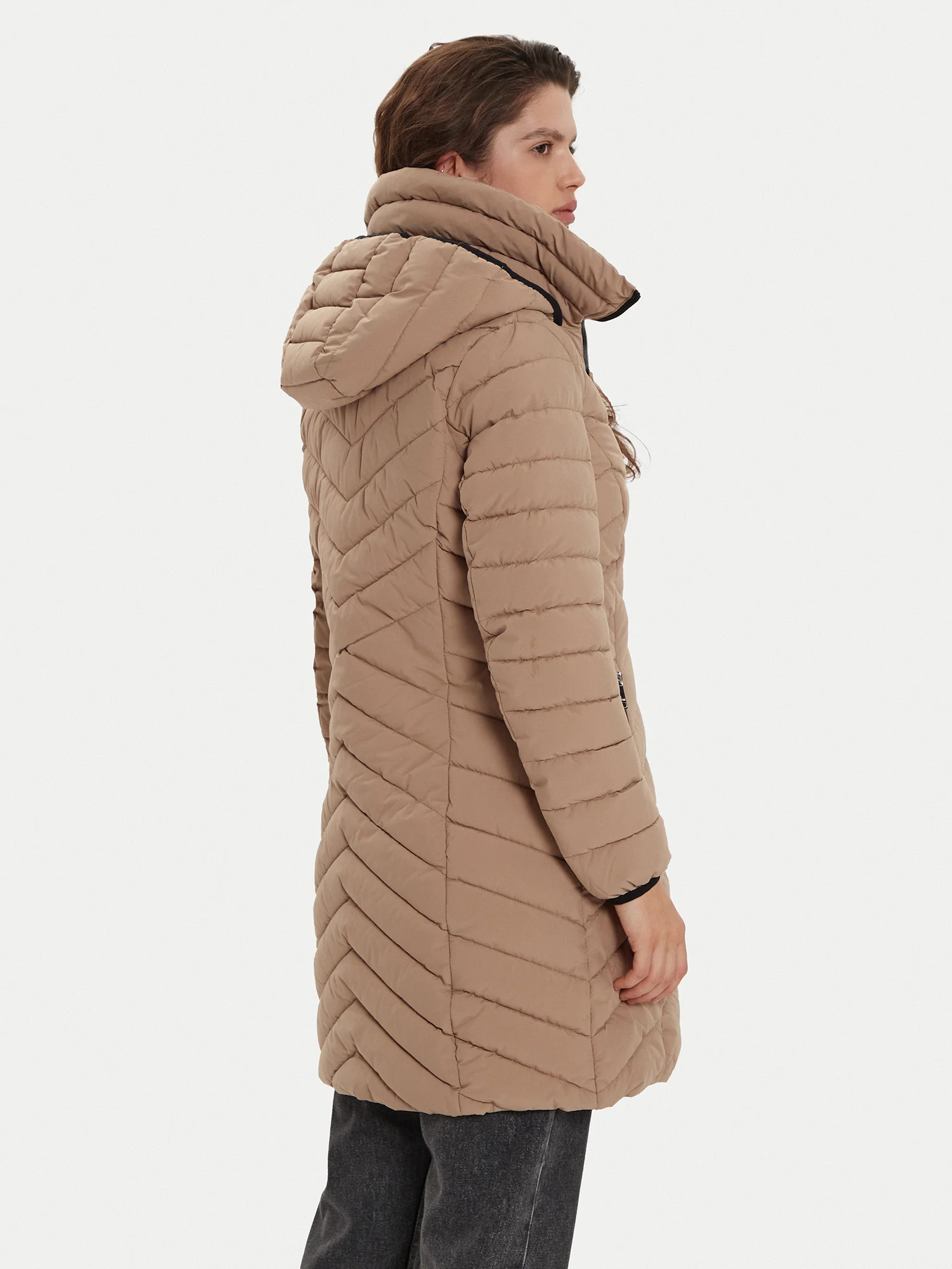 Женская зимняя куртка DKNY в бежевом цвете — стильный выбор для холодного сезона. Водоотталкивающее покрытие надежно защищает от влаги и ветра, а приталенный стёганый силуэт подчёркивает фигуру. Синтетический утеплитель сохраняет тепло даже в суровую погоду, капюшон защищает от снега и холода. Лаконичный дизайн и удобные боковые карманы на молнии делают модель универсальной для динамичных повседневных образов.