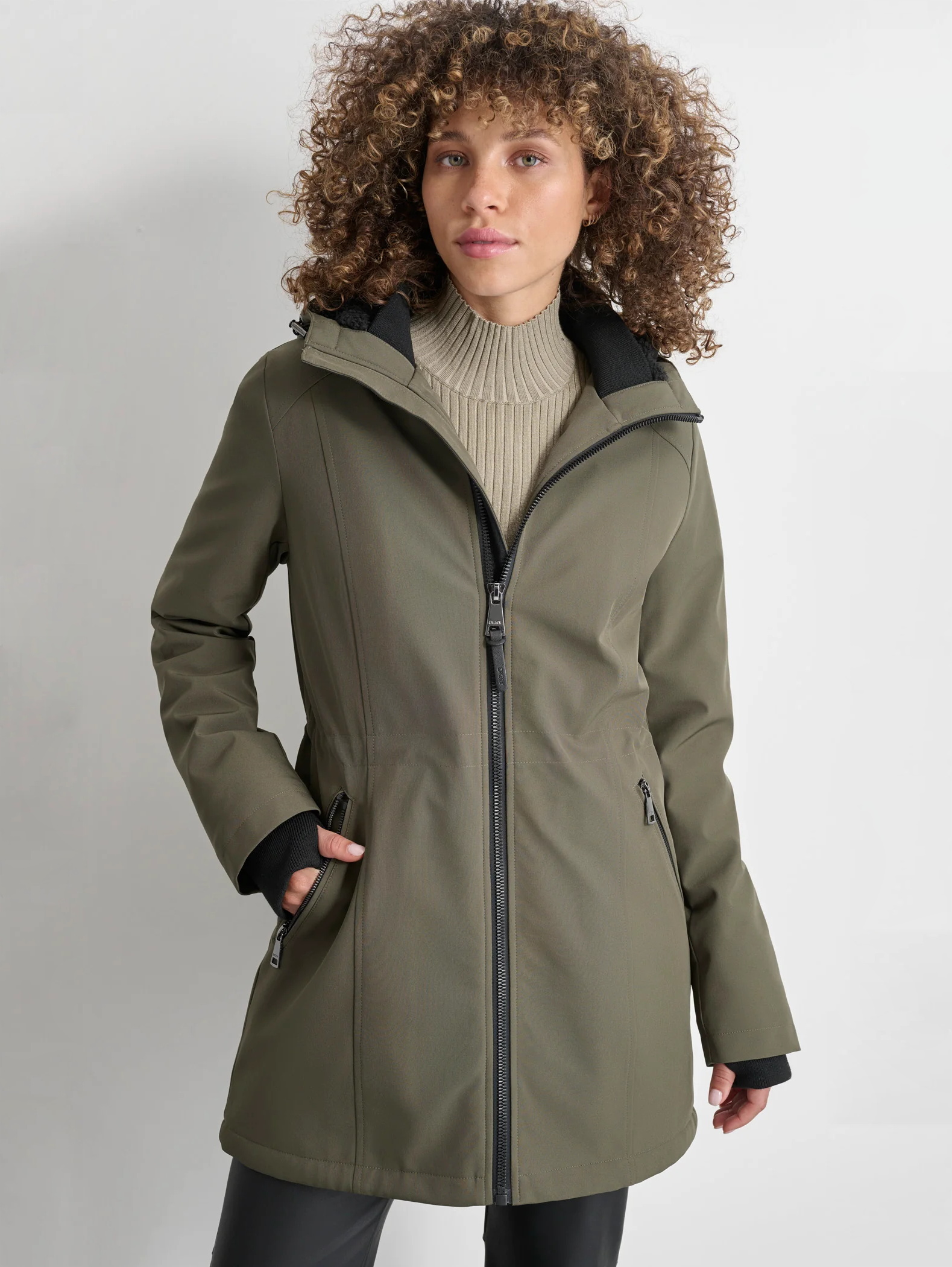 Женская куртка софтшелл с капюшоном от DKNY в зеленом цвете. Защищает от дождя и ветра. Приталенный крой, ассиметричный закругленный подол. Съемный утепленный капюшон. Застежка на молнию. Эластичный шнурок на талии позволяет регулировать посадку по фигуре. Внутренние манжеты с отверстием для большого пальца. Карманы на молнии.
