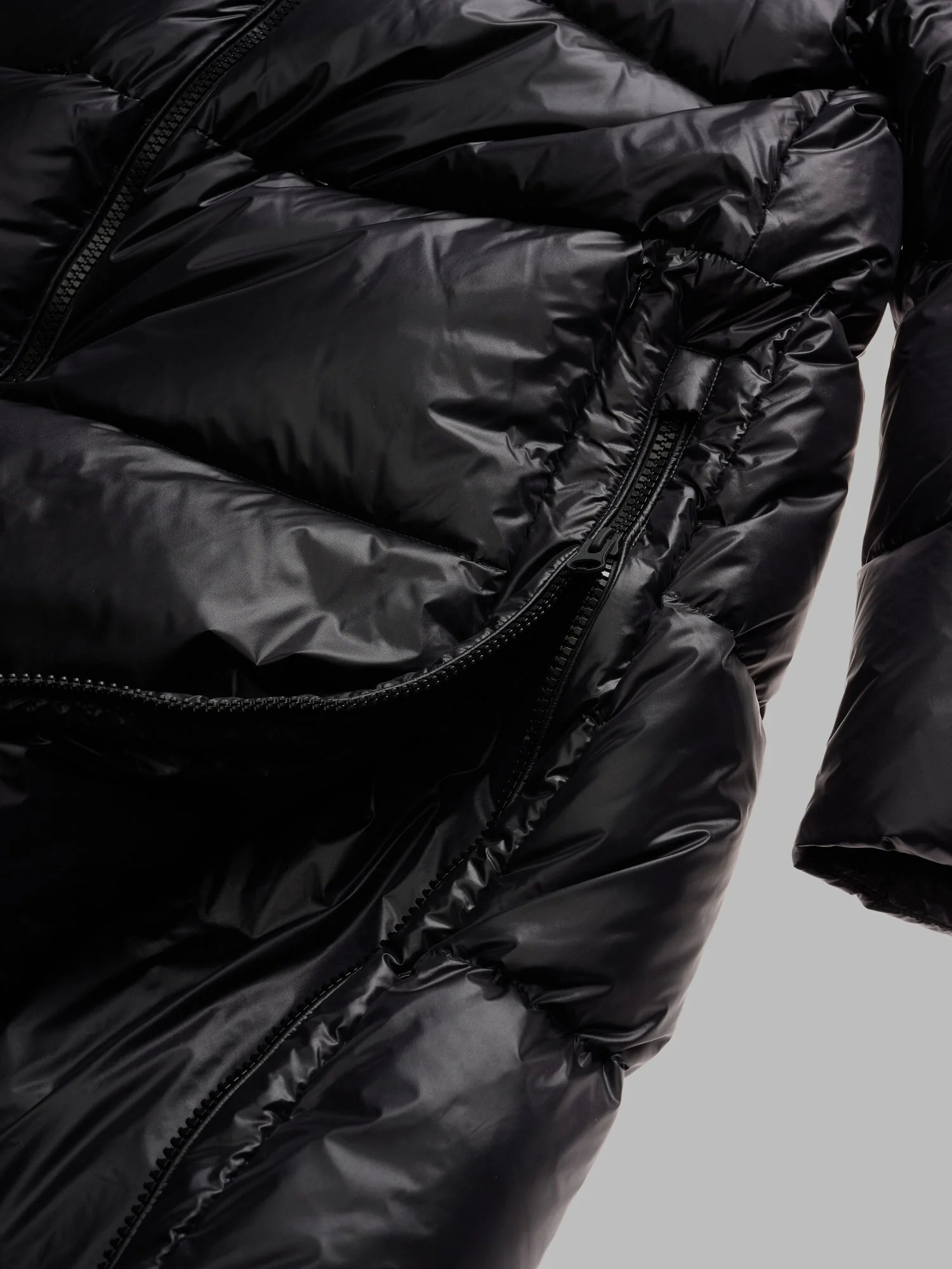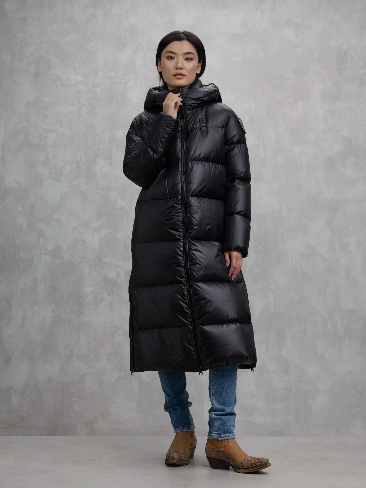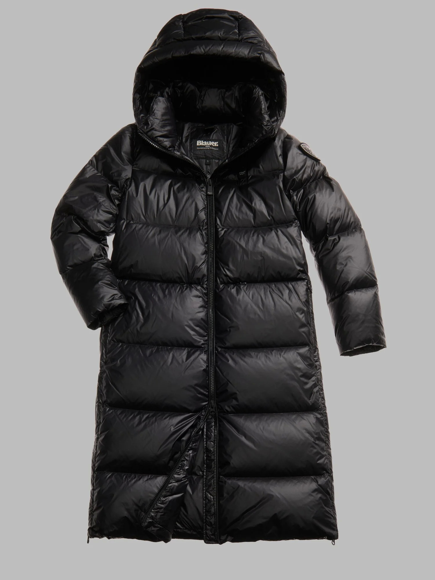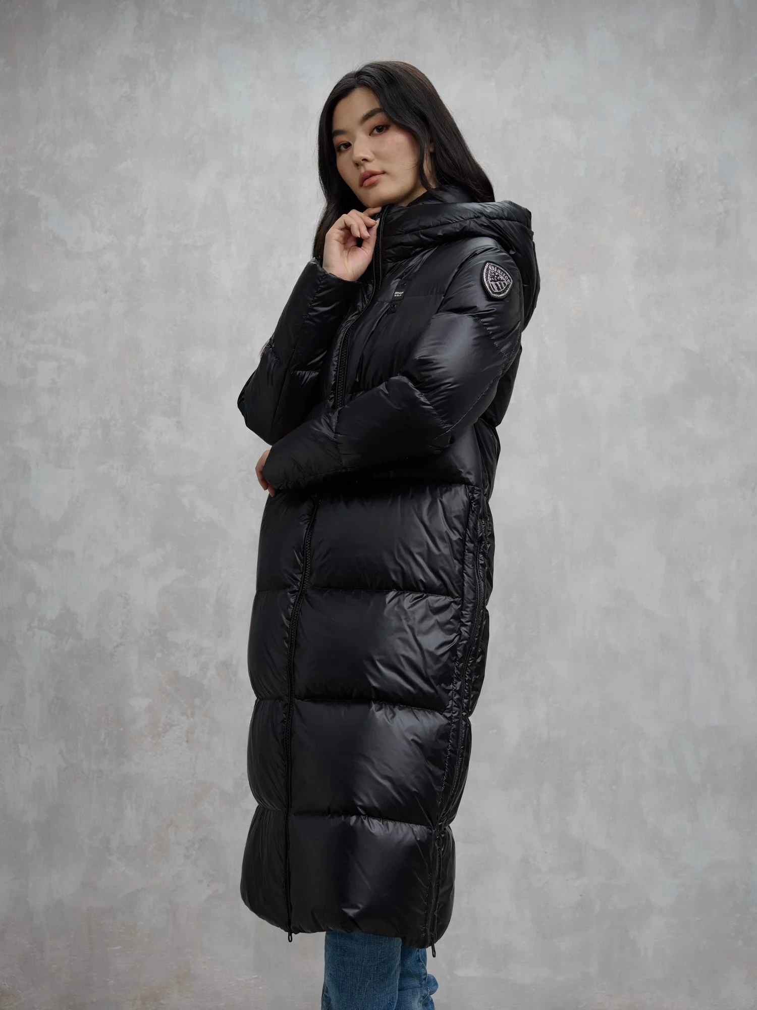 Женский зимний длинный пуховик с капюшоном CELIA от BLAUER выполнен из глянцевого нейлона с горизонтальной стёжкой. Утеплитель из натурального пуха 90/10 плотностью 345 г надёжно сохраняет тепло. Модель дополнена боковыми молниями по подолу для удобства при движении, внутренним воротником, двойными манжетами с резинкой и фирменной блестящей нашивкой с логотипом.