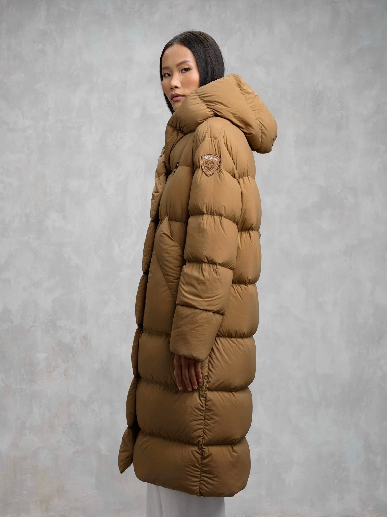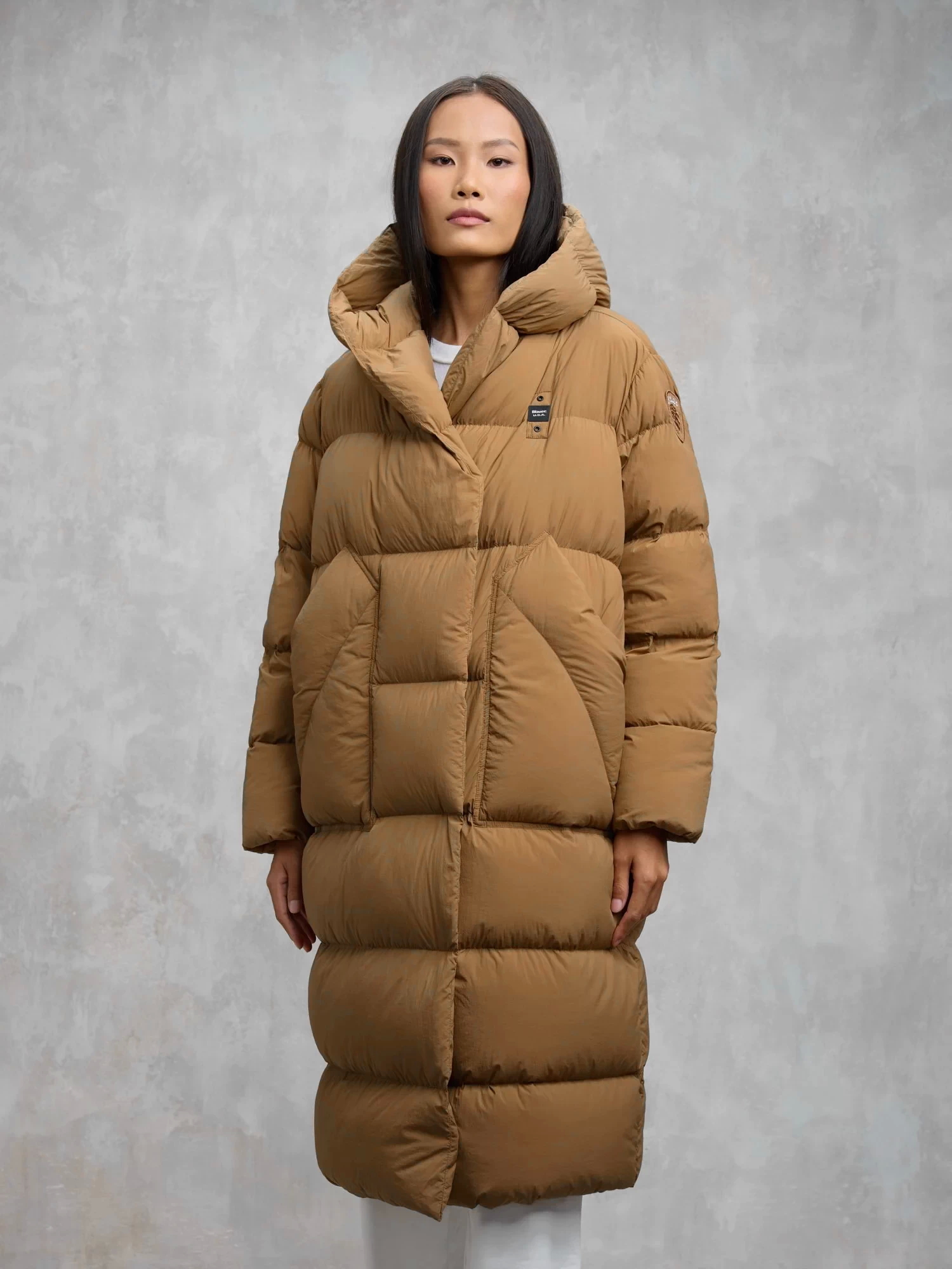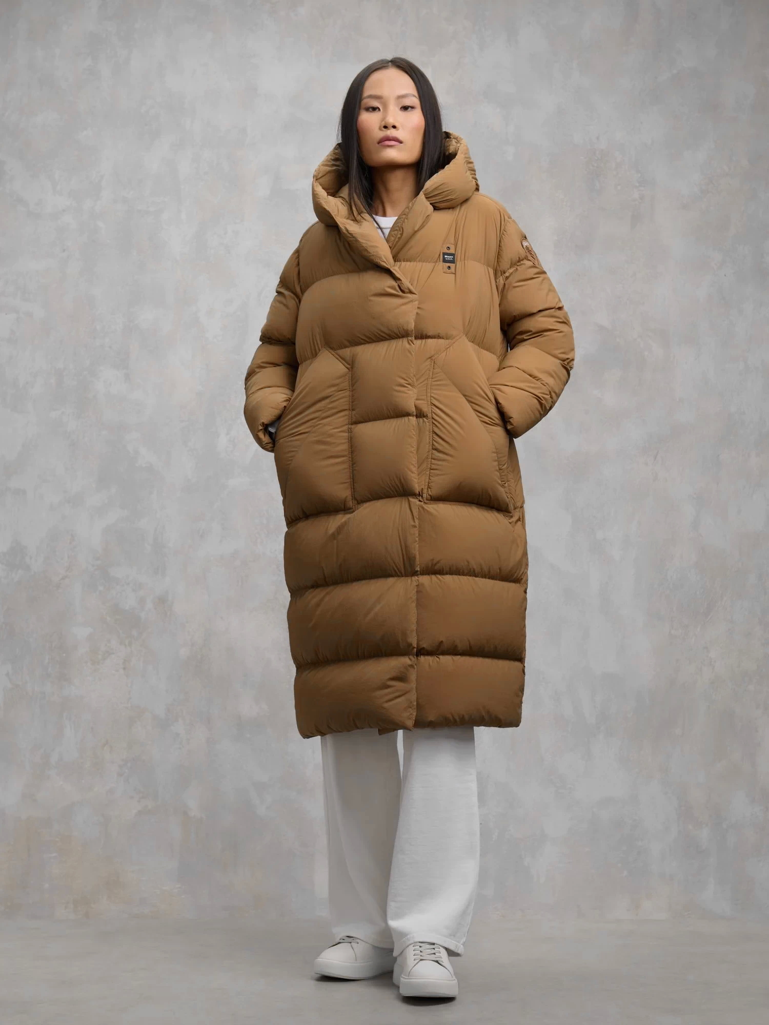 Женский стёганый длинный пуховик с капюшоном RUTH от BLAUER выполнен в светло-коричневом оттенке. Наполненный натуральным пухом 90/10 плотностью 300 г, он дарит ощущение мягкости и тепла, словно облако. Объемная модель с несъёмным капюшоном и подкладкой в тон оснащена застёжкой на магнитах, карманами на магнитных кнопках и внутренними карманами на липучках.