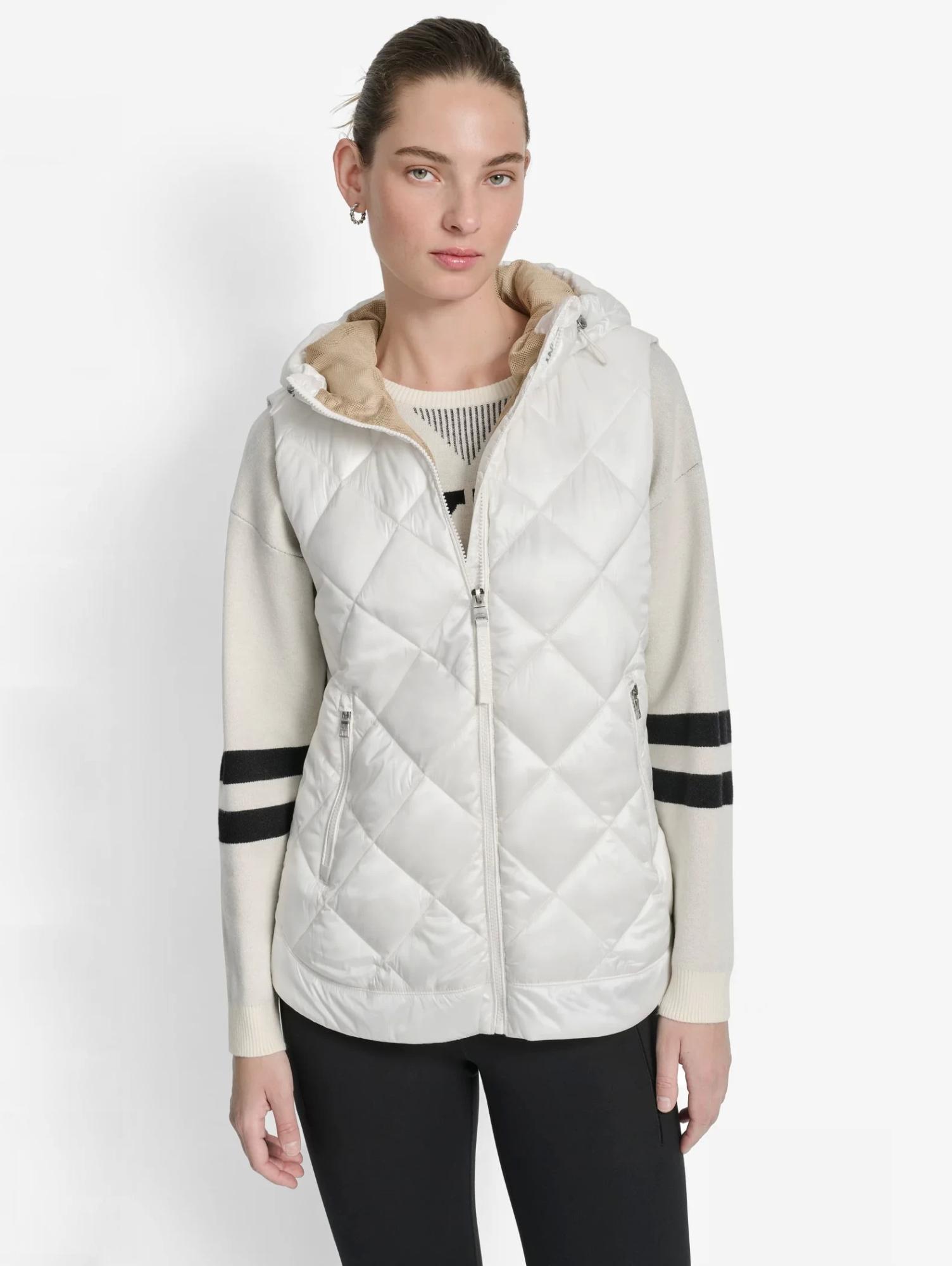 Женский утеплённый жилет DKNY — тёплая и стильная модель для прохладной погоды. Стёганый дизайн с синтетическим утеплителем и дышащей сетчатой подкладкой обеспечивает комфорт при низких температурах. Водоотталкивающая пропитка защищает от влаги. Высокий воротник и регулируемый капюшон усиливают защиту от холода и ветра. Боковые карманы на молнии с флисовой подкладкой сохраняют тепло.